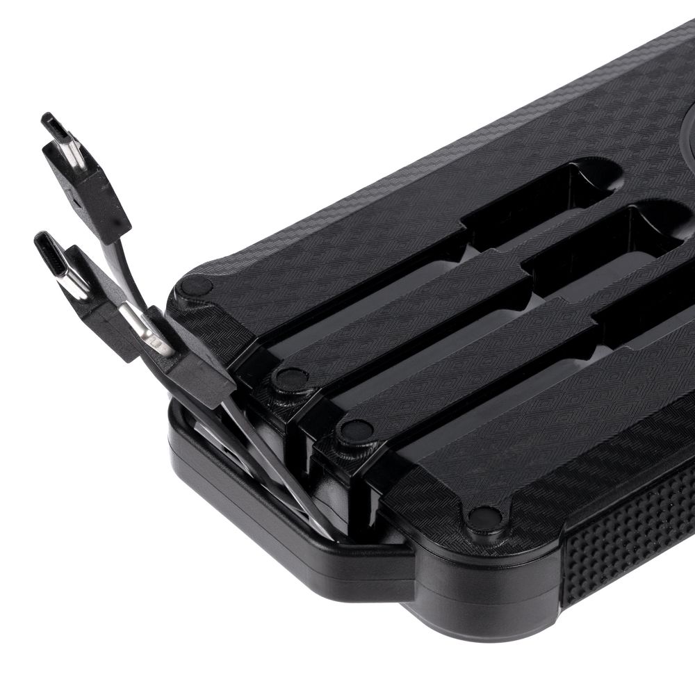Total Control — настоящий outdoor-аккумулятор с ударопрочным корпусом и защитой от пыли и брызг, который не страшно взять в поход. Область для беспроводной зарядки и 3 встроенных кабеля с разъемами Micro USB, Type C и Lightning позволяют удобно заряжать разные типы устройств, а солнечная батарея просто не позволит остаться совсем без связи. Яркий фонарик осветит путь или послужит светильником в палатке.