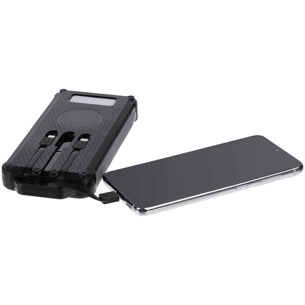 Прорезиненные вставки и рисунок на корпусе с имитацией карбона добавляют хорошей агрессивности внешнему виду аккумулятора — сразу видно, что его хозяин готов к приключениям.- Литий-полимерный аккумулятор