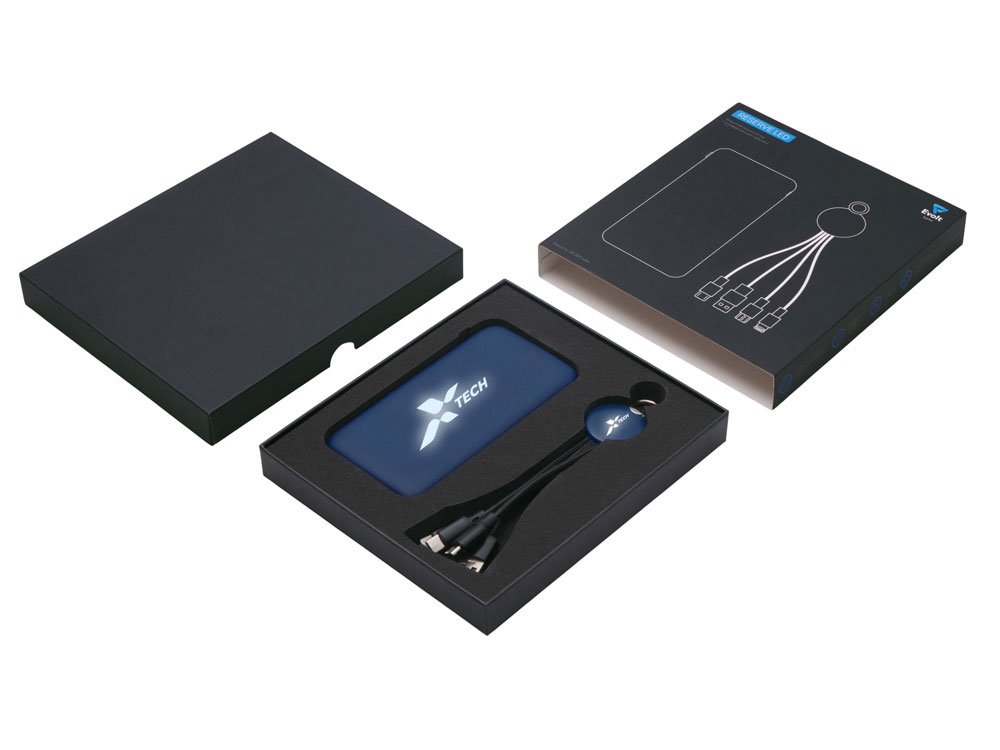 Практичный и стильный набор для зарядки в дороге: внешний аккумулятор на 10 000 мА·ч и универсальный кабель с тремя разъёмами (Micro USB, Lightning, USB Type-C). Оба элемента комплекта оснащены подсветкой логотипа — ваш бренд всегда на виду, даже в темноте. Повербанк обеспечивает 2–3 полных заряда смартфона и оснащён двумя выходами (USB-A и USB-C) для одновременной зарядки двух устройств. Поставляется в прочной подарочной коробке с шубером  — идеальное решение для корпоративных подарков.