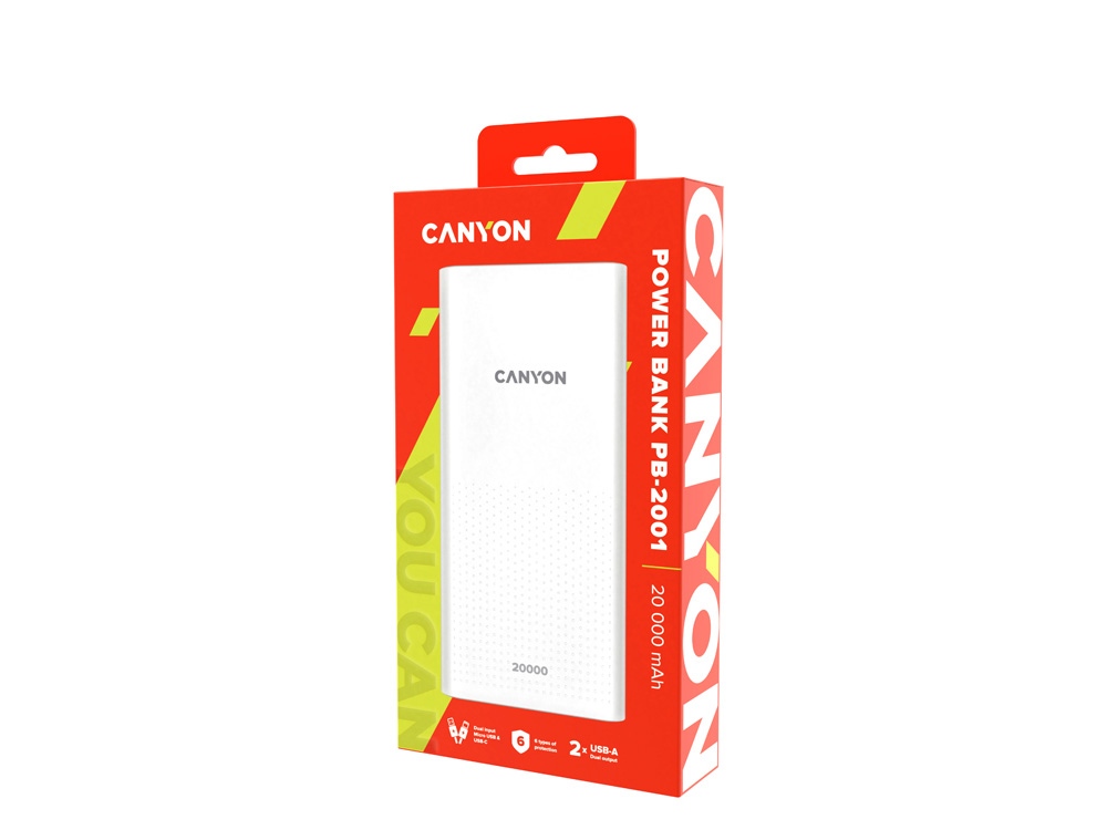 Каждый пользователь гаджетов сталкивался с проблемой — смартфон или наушники разряжаются на самом интересном месте сериала, игры или горячего диалога в чате! Чтобы вы могли пользоваться мобильным устройством в течении всего дня, не опасаясь о разряженной батарее, Canyon выпустил модель аккумулятора PB-2001. Ее отличает максимальная емкость при довольно компактном размере, а также 2 зарядных входа — Micro-USB и Type-C. Аккумулятор заряжает 2 устройства одновременно через выход USB-A. Кроме того, повербанк снабжен шестью типами защиты и облачен в стильный темно-графитовый или белый корпус. Максимум производительности и минимум места в вашей сумке! -