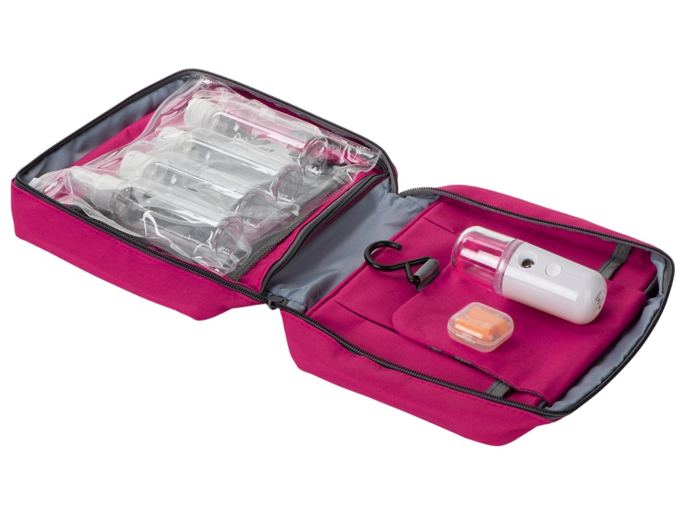 несессер- полиэстер, увлажнитель- пластик, емкости- ПВХ, беруши- полиуретан