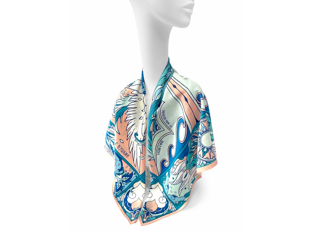 В центре авторского принта — удивительной красоты женщина с белоснежными крыльями, наделенная магическими способностями и житейской мудростью. Оригинальное сочетание тонов, цветочных орнаментов и русского колорита делают аксессуар нежным и самобытным.