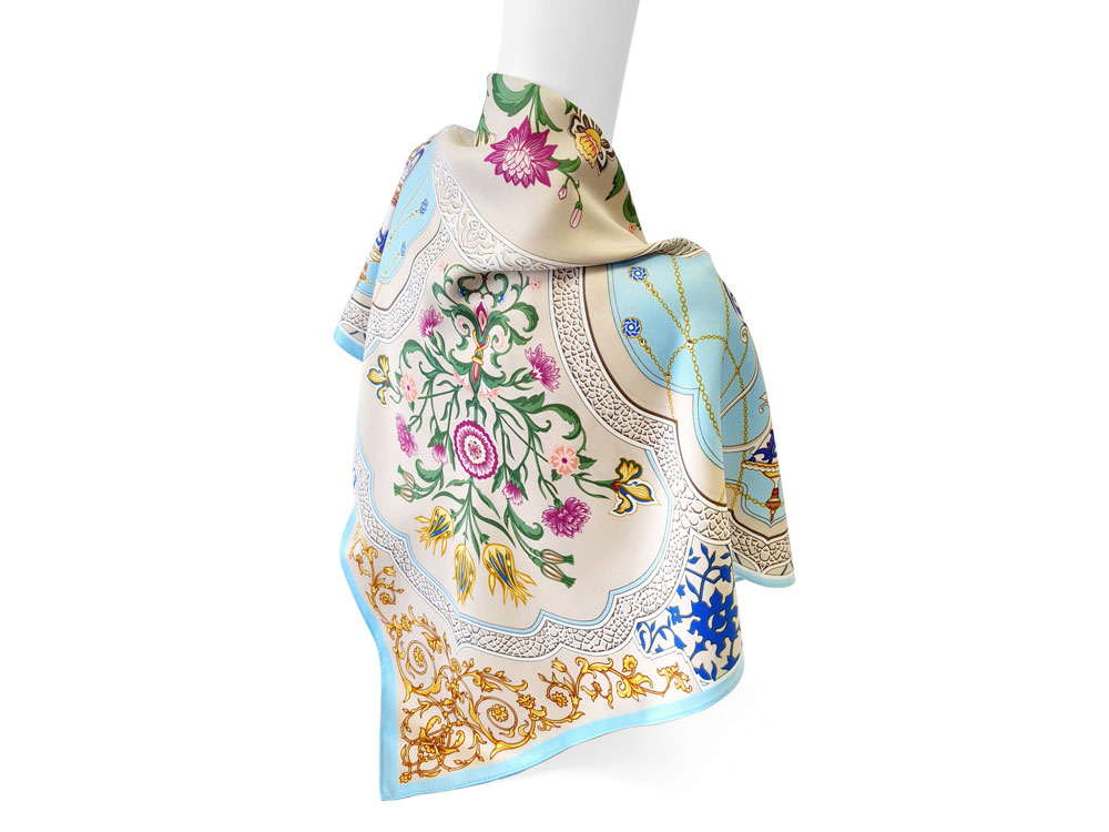 Принт аксессуара образуют знаменитые орнаменты востока — гирих (бесконечный узел”) и ислими (путь в божественный сад”). Непрерывные витиеватые линии в сочетании с узорами из гибких стеблей с зеленой листвой и пестрыми соцветиями завораживают, погружают в состояние медитации, постижения тайны мироздания через призму счастья и красоты.