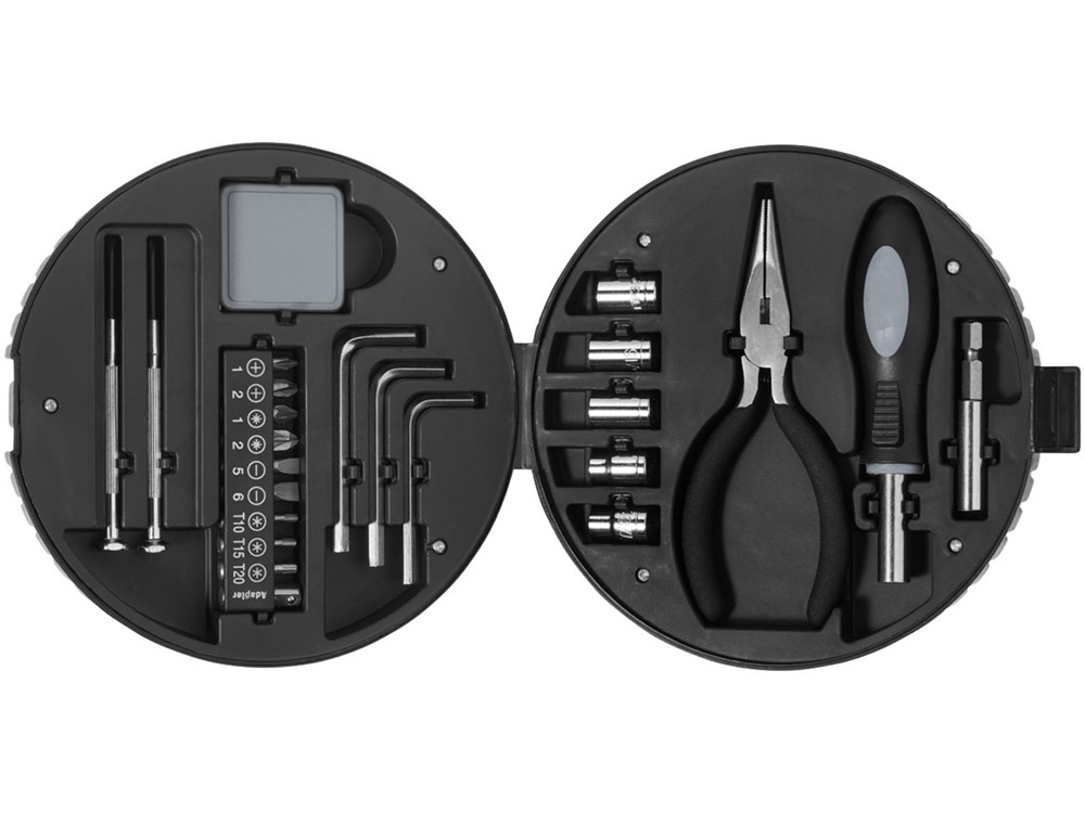 Набор из 25 инструментов включает измерительную минирулетку, крестообразную отвертку, плоскую отвертку, 9 насадок с адаптером (4 крестообразных шлицев, 2 плоских шлица и 3 шестигранных шлица), 3 шестигранных ключа, 5 головок (5-9 мм), острогубцы, рукоятку отвертки, адаптер для насадок и удобный футляр. -
