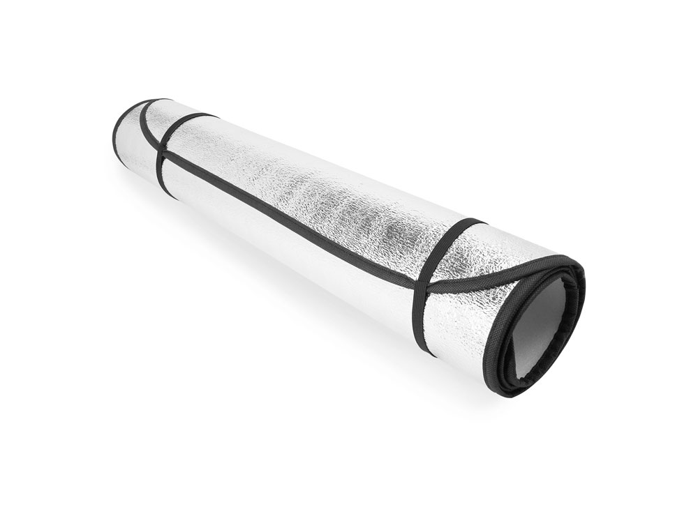 Прямоугольный автомобильный солнцезащитный козырек с алюминиевой передней частью и белой пенопластовой задней частью. Два металлических люверса в обоих верхних углах для присосок. Черная окантовка и эластичные лямки для складывания. -