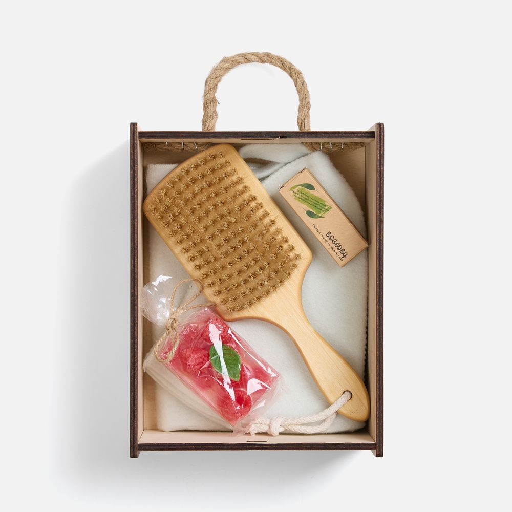коробка - дерево, береза; банная шапка и коврик - шерсть 40%, полиэфир 60%; войлок; щетка - дерево, карельская береза; щетина кабана средней жесткости