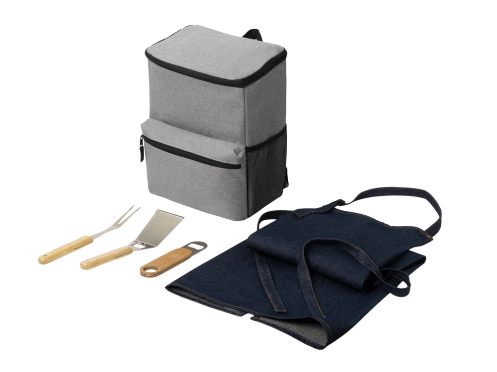 рюкзак- 100% полиэстер, фартук- хлопок, аксессуары- дерево, нержавеющая сталь