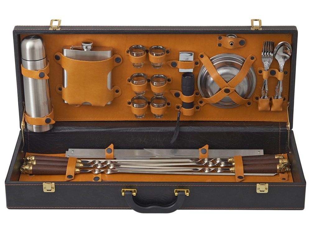 Все аксессуары надежно крепятся к кейсу кожаными ремешками на кнопке, обеспечивая удобство транспортировки и сохранность содержимого.