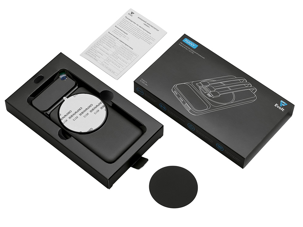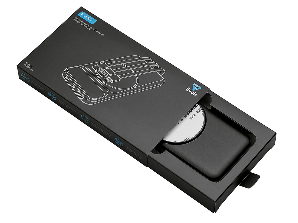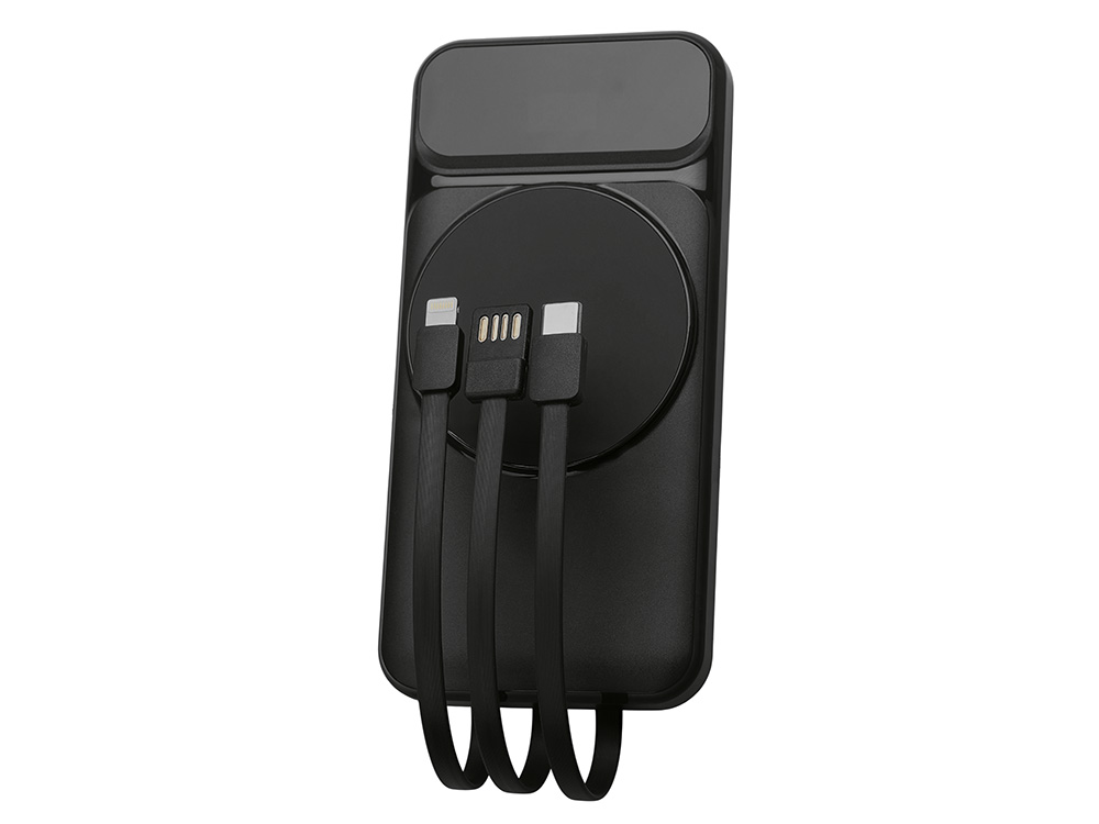 Магнитный беспроводной внешний аккумулятор со встроенными кабелями Мэни, 10000 мАч