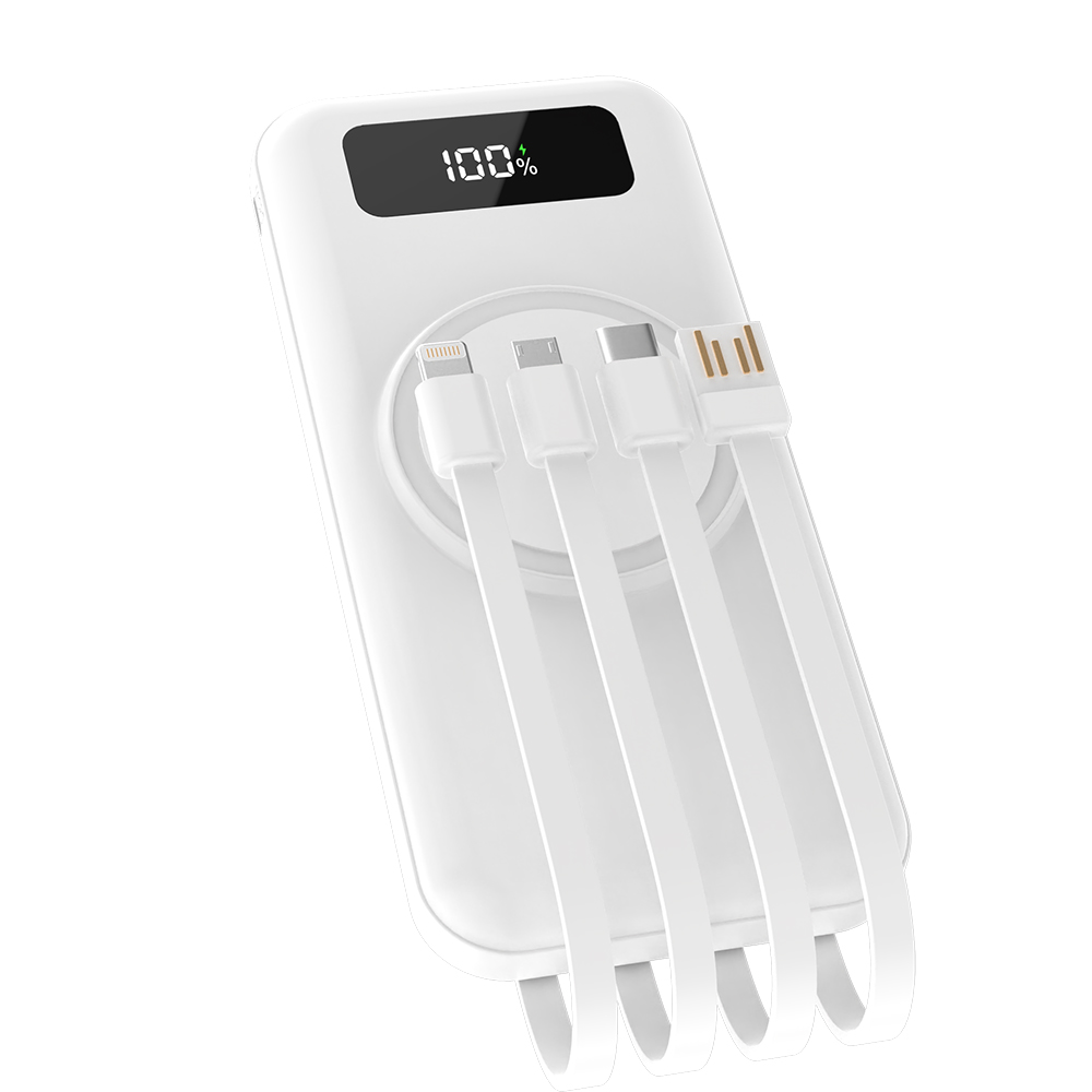 Один из самых продвинутых и практичных внешних аккумуляторов емкостью 10 000 мАч — это идеальное сочетание технологий, надежности и современного дизайна. Его стильный корпус гармонично объединяет весь функционал, необходимый активным пользователям, ценящим мобильность и комфорт. На передней панели расположен яркий индикатор заряда, позволяющий в любой момент контролировать уровень энергии. Встроенная беспроводная зарядка мощностью 5W делает зарядку ваших устройств по-настоящему удобной — просто положите смартфон или другую тоже поддерживающую функцию, и он начнет заряжаться без лишних проводов. Инновационный дизайн корпуса включает встроенные кабели питания — Micro-USB, Lightning и Type-C (5V/2A), что избавляет вас от необходимости носить с собой лишние кабели и обеспечивает максимально быстрое подключение. Усиленная батарея, рассчитанная на более чем 500 циклов зарядки и разрядки, гарантирует долгий срок службы и стабильную работу устройства. Этот аккумулятор — надежный спутник для путешествий, деловых поездок и ежедневных приключений, объединяющий современные технологии и высочайшее качество в одном стильном корпусе.- Цвет: Белый