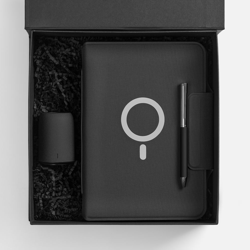 Центральное место в наборе, конечно, занимает органайзер Oiro с блокнотом, подставкой для смартфона и встроенным аккумулятором для беспроводной зарядки — практичное смарт-решение в организации рабочего процесса, где каждая деталь продумана для максимального комфорта и подлинного удовольствия.