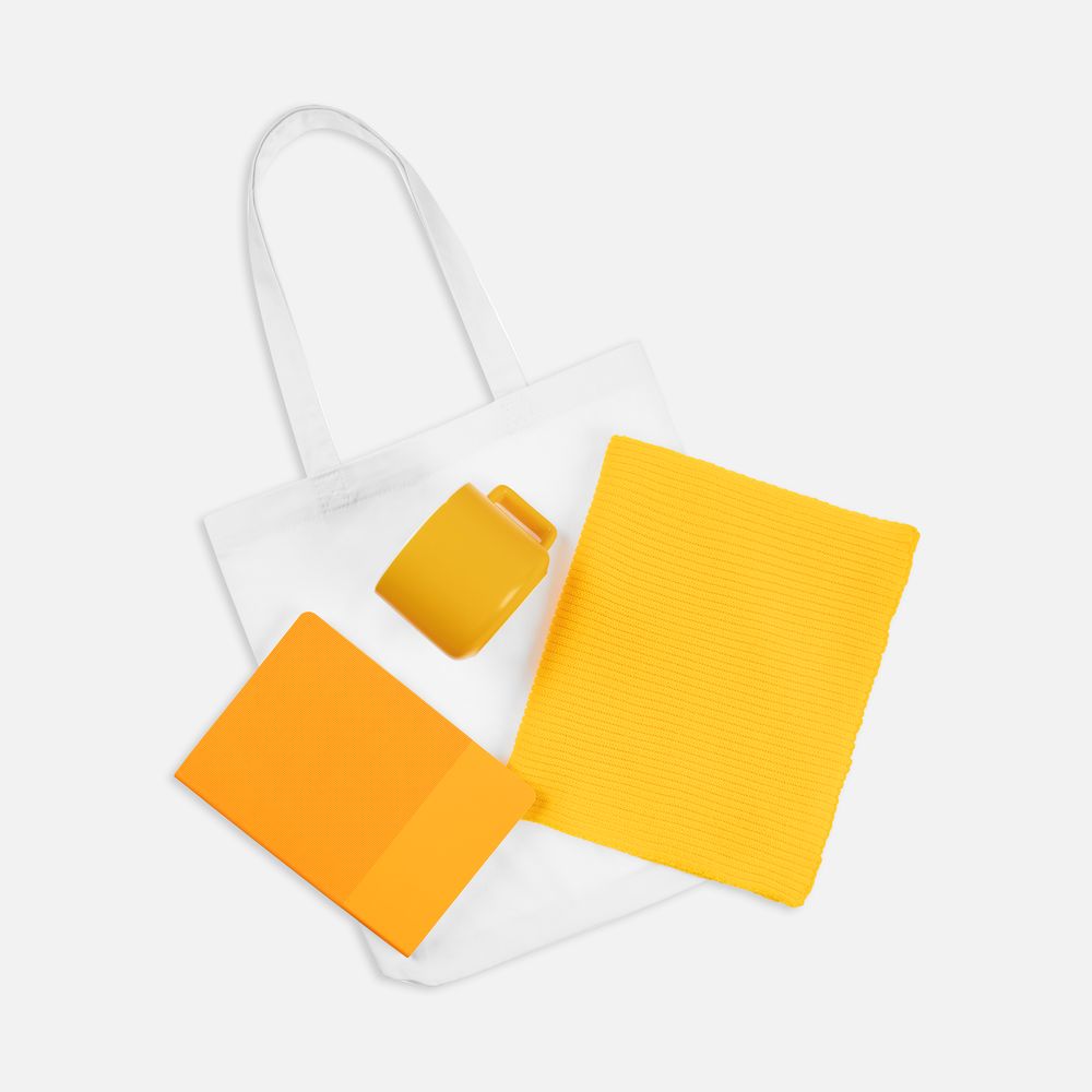 сумка - хлопок 100%; шарф - акрил 100%; ежедневник - искусственная кожа; кружка - каменная керамика