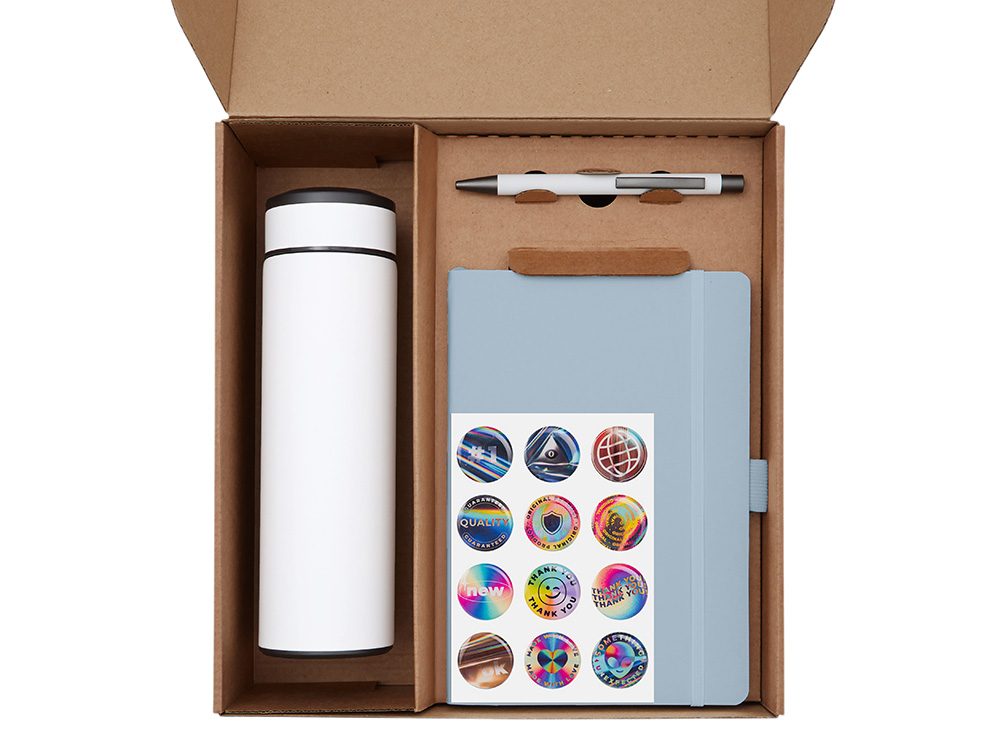термос - нержавеющая cталь с покрытием софт-тач, блокнот - искусственная кожа с покрытием софт-тач, ручка - металл с покрытием софт-тач, чай - крафт-пакет, стикеры - смола, держатель для телефона - пластик, коробка - картон