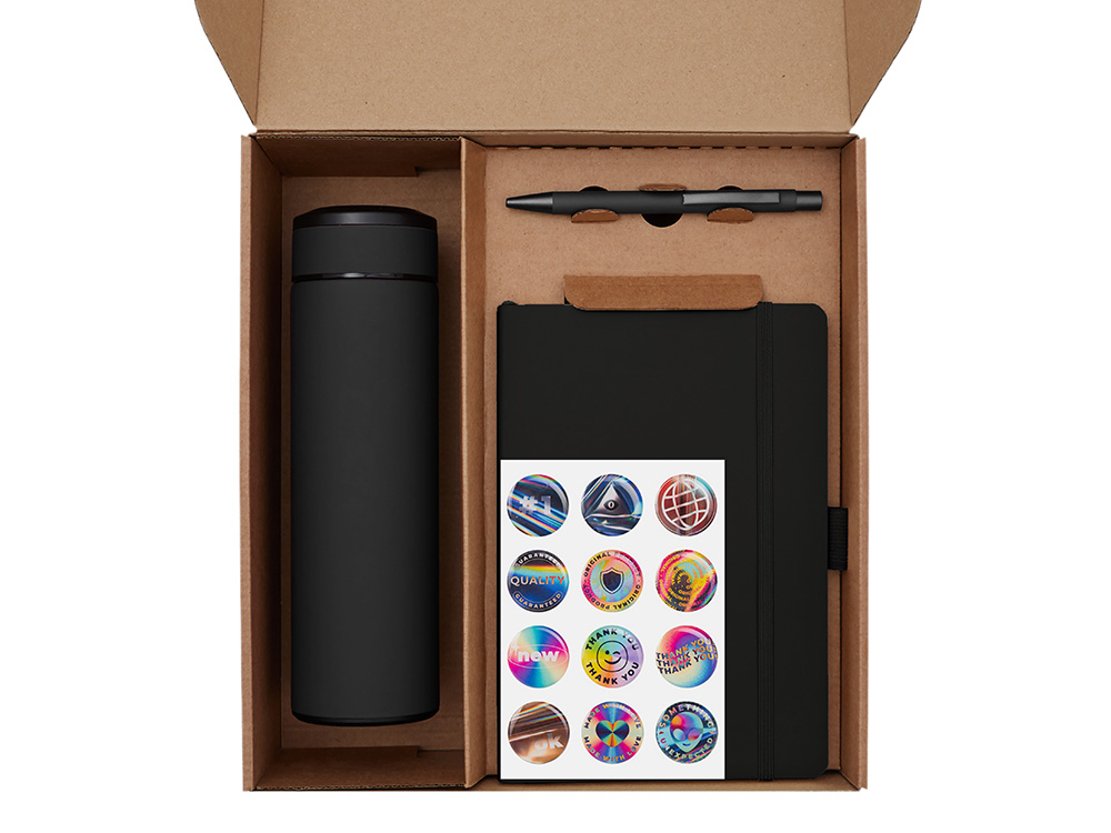 термос - нержавеющая cталь с покрытием софт-тач, блокнот - искусственная кожа с покрытием софт-тач, ручка - металл с покрытием софт-тач, чай - крафт-пакет, стикеры - смола, держатель для телефона - пластик, коробка - картон