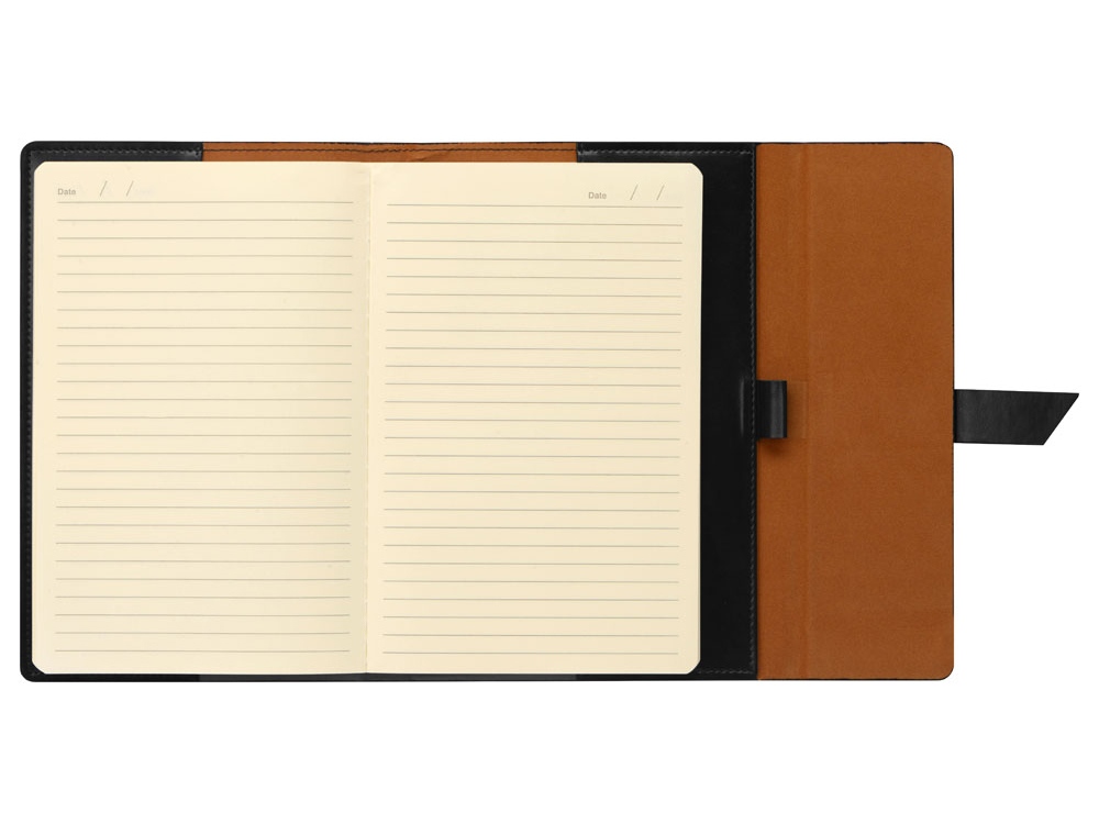 Бизнес-блокнот формата А5 в твердой обложке из искусственной кожи станет отличным подарком для любого клиента. Блокнот состоит из обложки с клапаном и сменного блока с линованными страницами. Внутри обложки есть петля для ручки в тон (ручка в комплект не входит). -