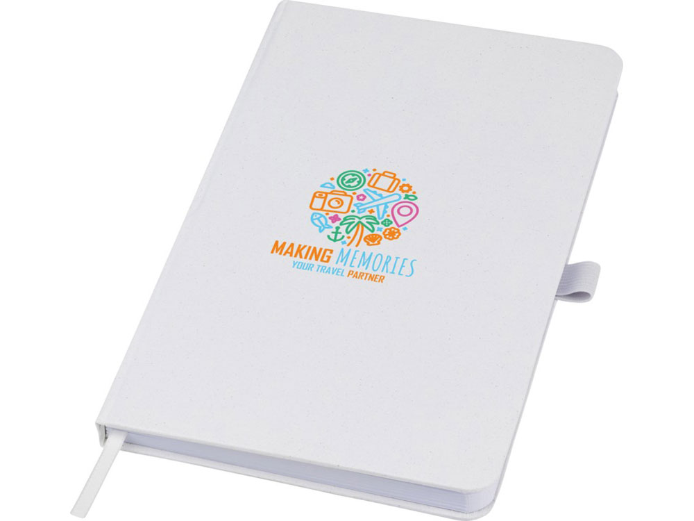 Легкий блокнот в твердой обложке для повседневных заметок с обложкой из материалов из ответственных источников. Коричневая обложка содержит остатки кофе, зеленая — остатки оливок, а белая — кукурузы. Имеет 80 листов (70 г/м²) из переработанной белой линованной бумаги.