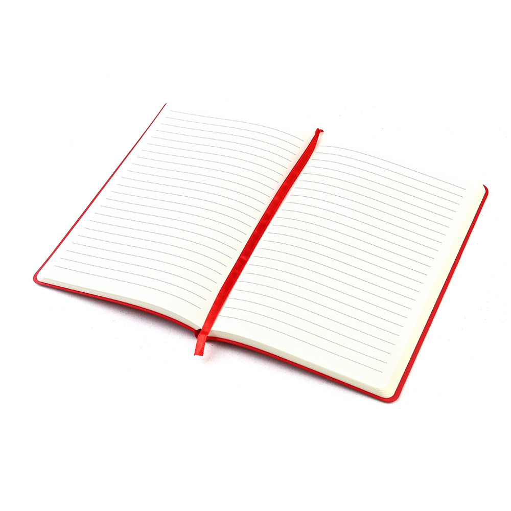 Блокнот формата А5 с мягкой обложкой из PU-материала, имеющего текстуру, имитирующую поверхность натуральной кожи; с текстильной закладкой в цвет блокнота, 256 страниц, плотность 70г/м, страницы с черными линиями. Цвет по PANTONE® (максимально приближен): 186C.- Виды нанесений: УФ-печать А2, Тиснение, Гравировка CO2-А2, Тиснение фольгой, УФ-Лак, УФ-Цвет+Лак