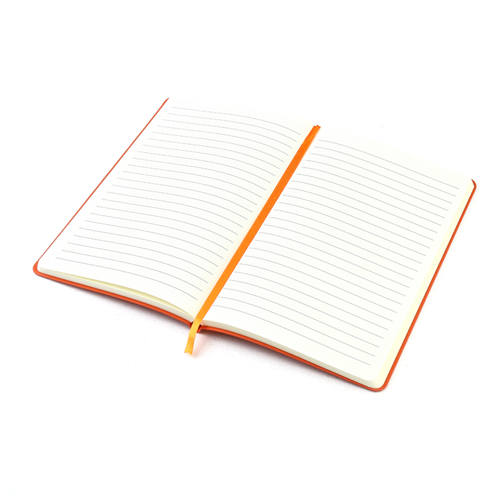 Блокнот формата А5 с мягкой обложкой из PU-материала, имеющего текстуру, имитирующую поверхность натуральной кожи; с текстильной закладкой в цвет блокнота, 256 страниц, плотность 70г/м, страницы с черными линиями. Цвет по PANTONE® (максимально приближен): 166C.- Виды нанесений: УФ-печать А2, Тиснение, Гравировка А2, Тиснение фольгой, УФ-Лак, УФ-Цвет+Лак