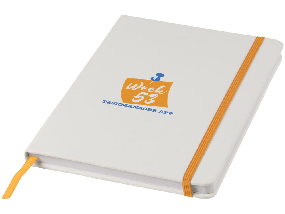 Белый блокнот A5 с цветной эластичной закладкой и резинкой. 96 страниц (60g/m2), линованная бумага. На обложке возможна цифровая печать. -