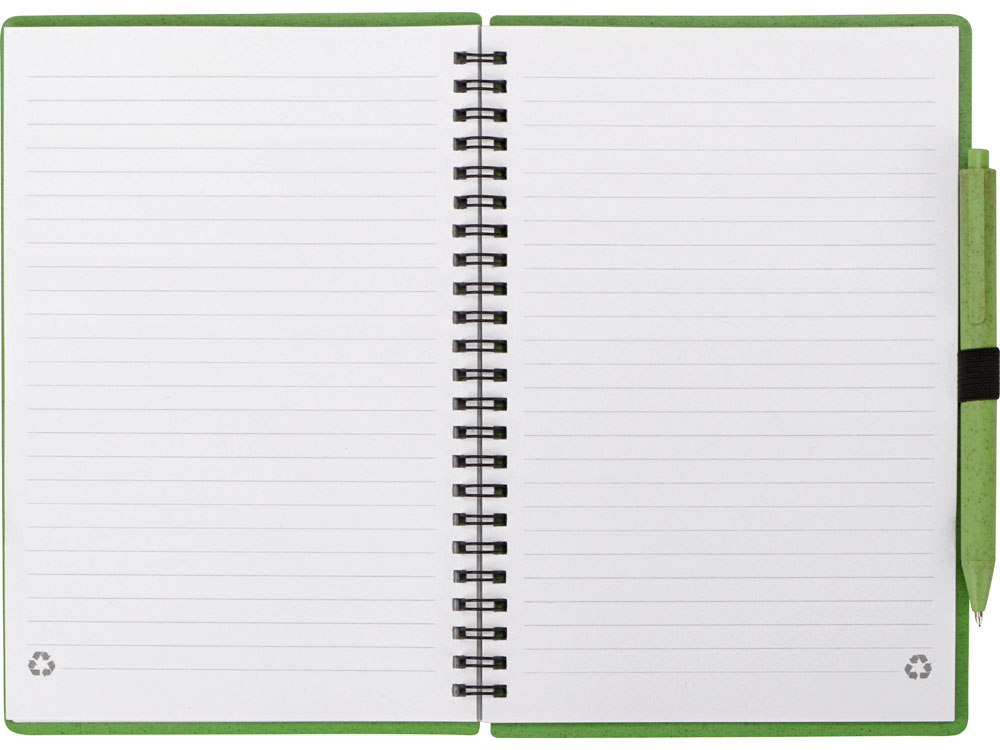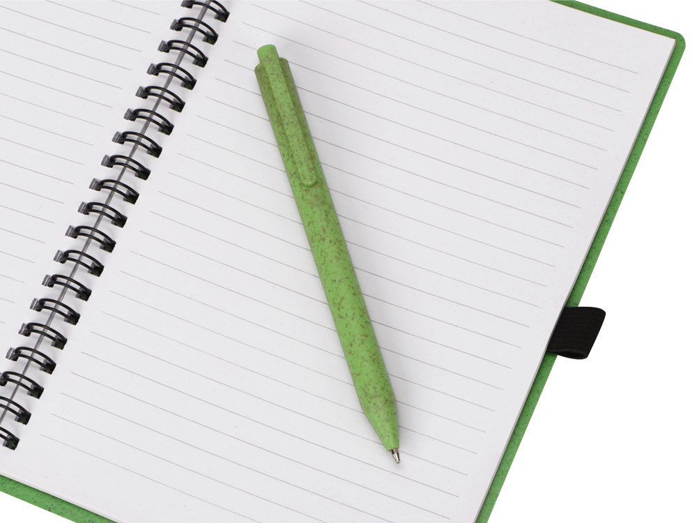 Блокнот с обложкой из переработанной пшеницы и пластика. Блок состоит из 80 листов переработанной бумаги белого цвета. Крепление - пружина. В комплекте шариковая ручка в тон блокноту из пшеничной соломы. -