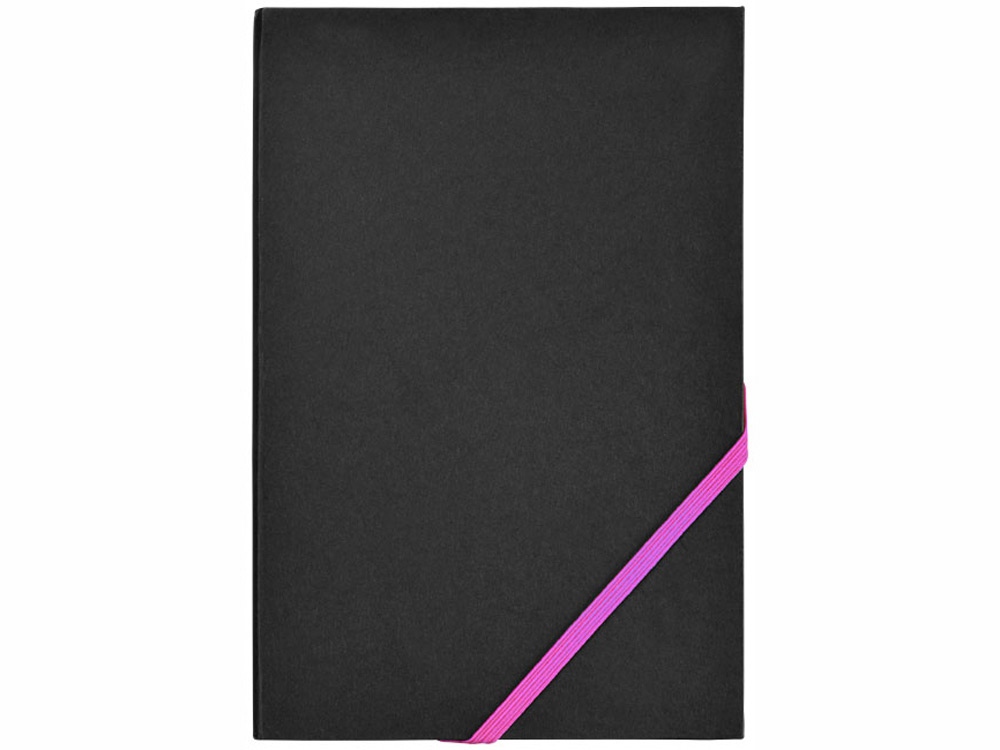 Блокнот, ориентировочный формат A5 с 80 листами бежевой бумаги (70 г/м²) с диагональной эластичной застежкой и яркими неоновыми краями. -