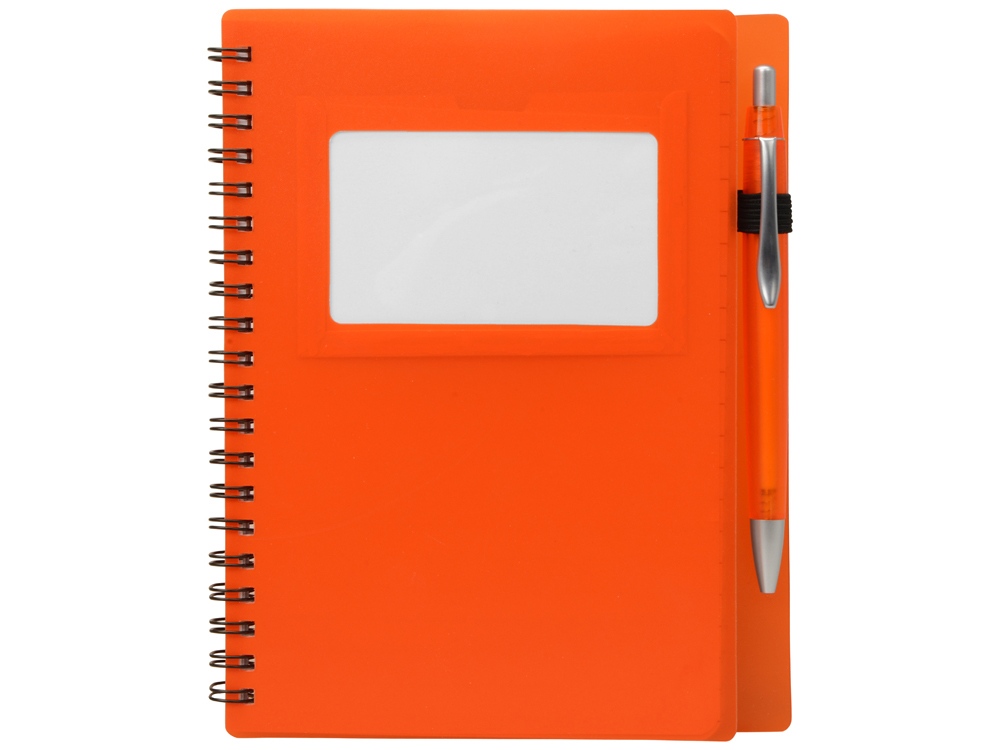 Блокнот Контакт в полипропиленовой обложке переплетен на пружине. В обложке блокнота предусмотрено окошко, в которое можно поместить визитную карточку или полиграфическую вставку. В комплекте с блокнотом идет ручка, которая вставляется в петельку сбоку.
