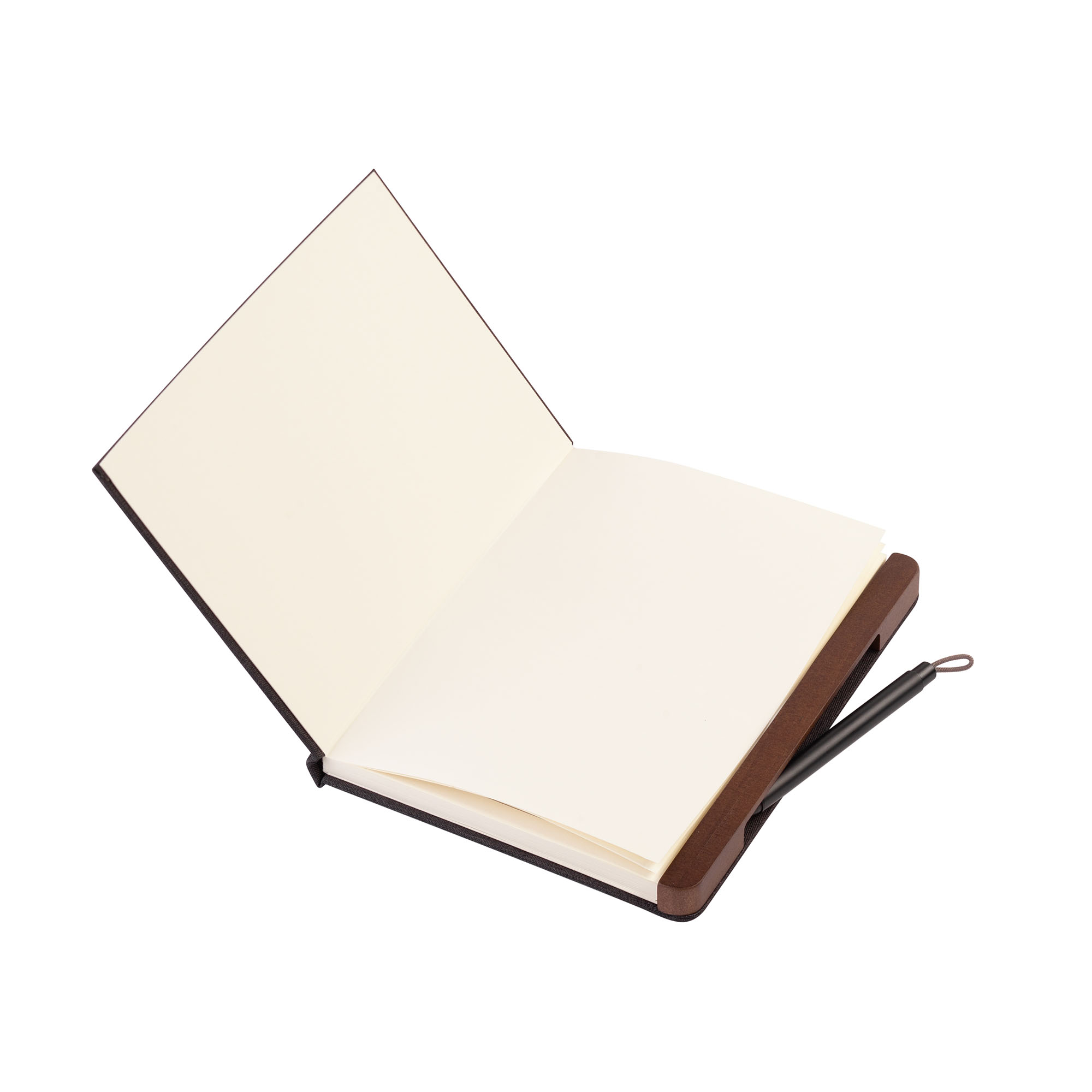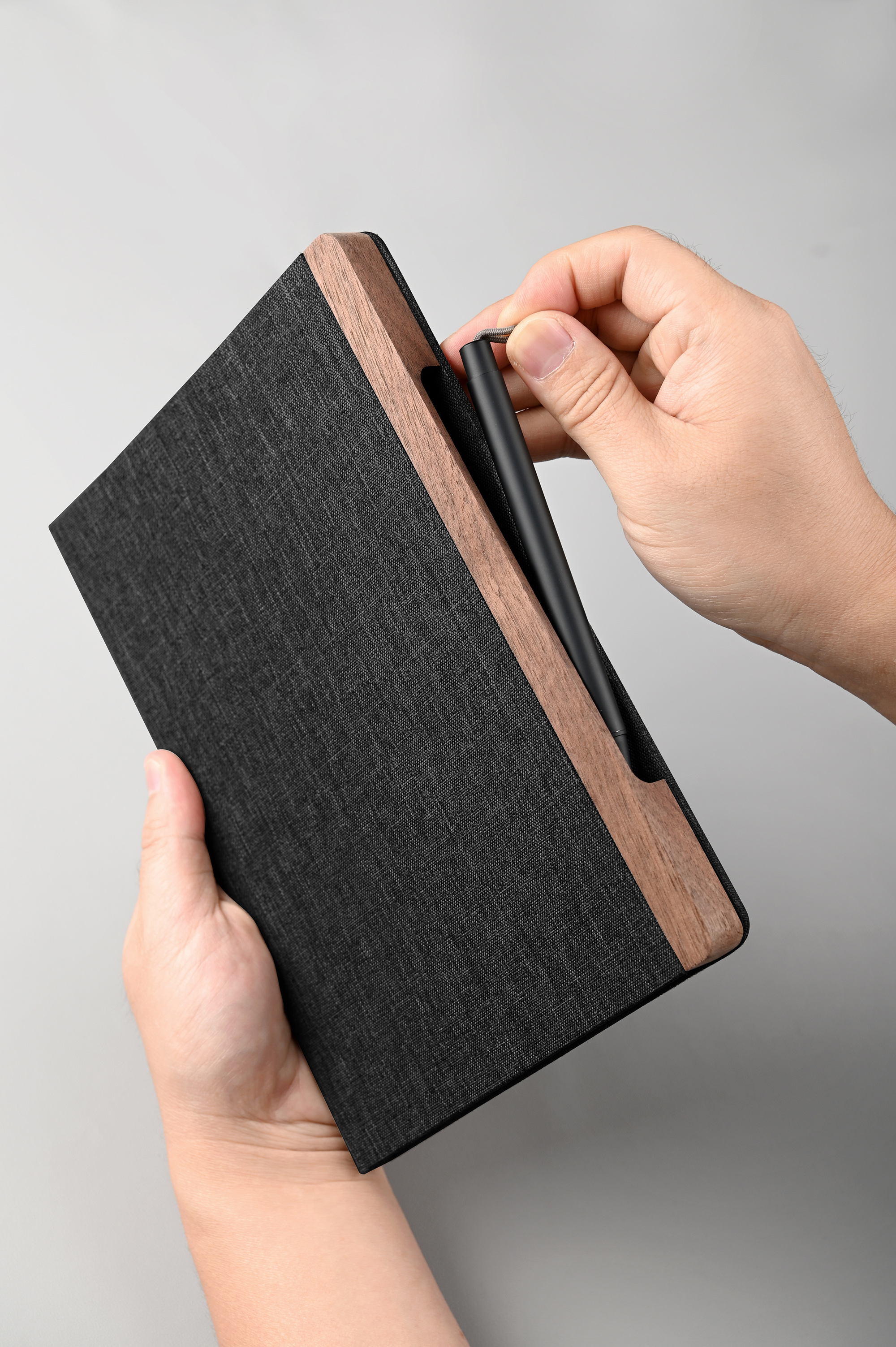 Невероятно оригинальная конструкция набора 2 в 1 - металлическая ручка скрыта и плотно держится в магнитном пенале из натурального дерева, закрепленном на обложке блокнота. При этом ручку легко извлечь, просто потянув за петельку на нажимной кнопке.