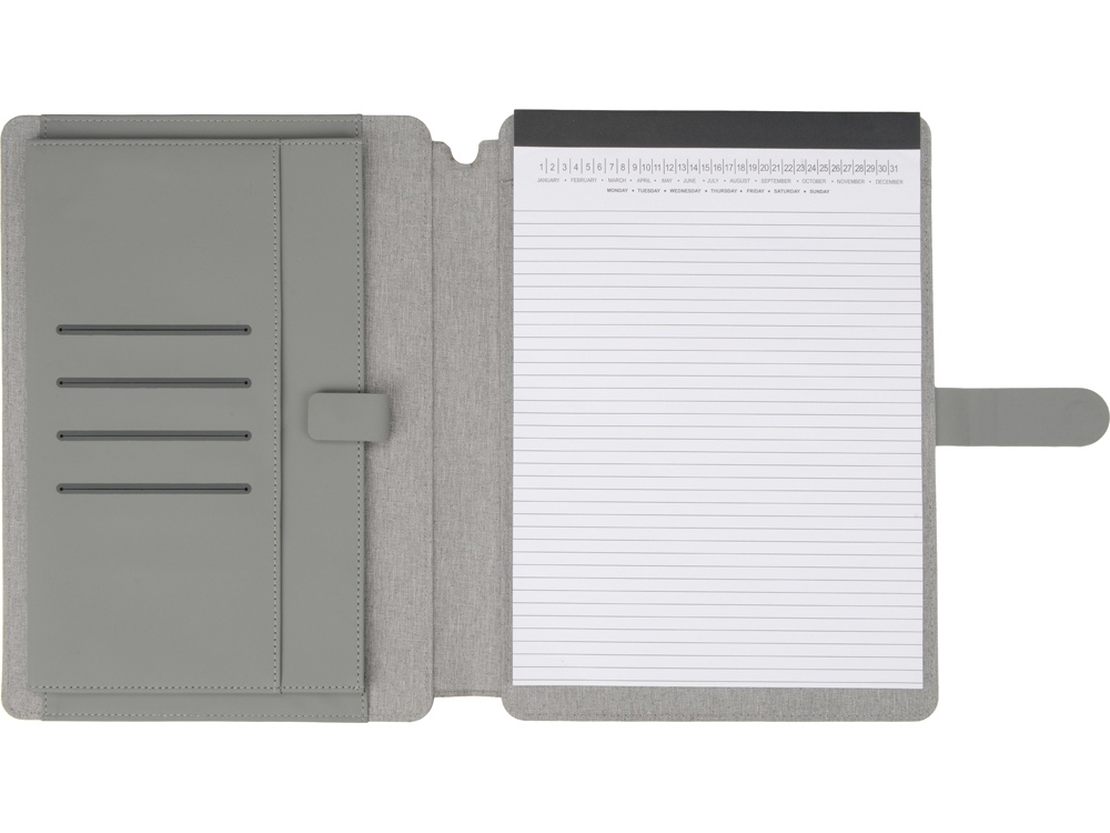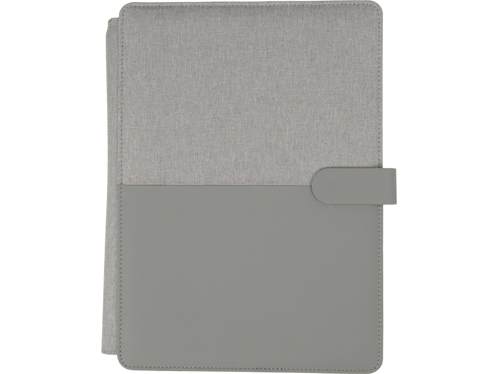 Стильная папка для документов формата А4 с комбинированной обложкой из текстиля и искусственной кожи. Удобный внутренний органайзер имеет карман на застёжке для планшета, блокнот для записей с линованной бумагой. -