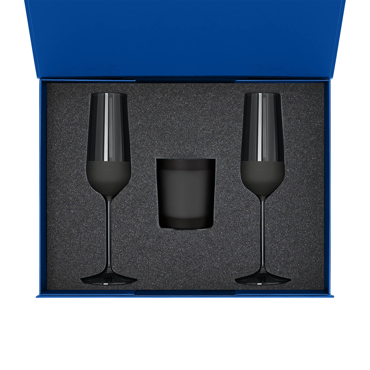 Подарочный набор свеча Энигма (Enigma) + 2 бокала для шампанского Блэк Эдишн (Black Edition) в синей коробке