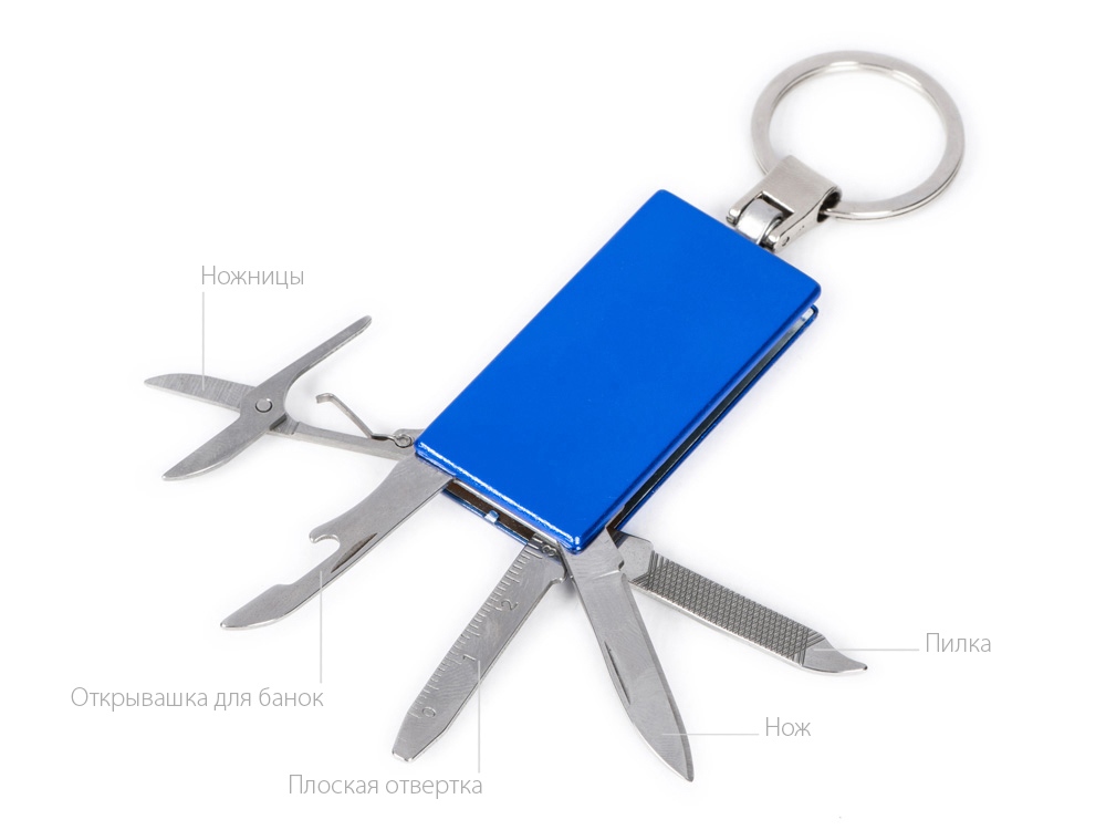Брелок-мультитул на кольце в металлическом корпусе с заметным полем под нанесение.
