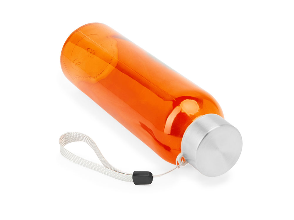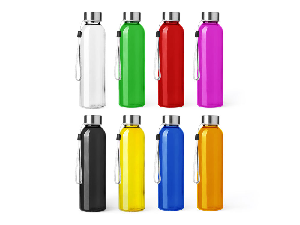 Стеклянная бутылка емкостью 500 мл. Большое разнообразие цветов, с завинчивающейся крышкой из нержавеющей стали и удобной для транспортировки благодаря ремешку серого цвета. -