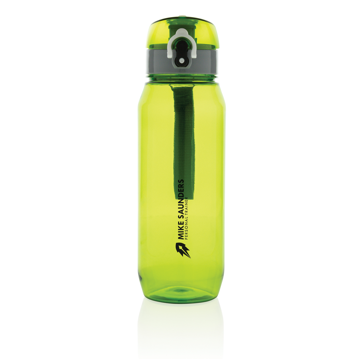 Бутылка для воды Tritan объемом 800 мл. Прозрачная бутылка из экологичного материала, который не впитывает запахи и не содержит бисфенол. У бутылки удобная крышка, которая открывается нажатием на кнопку, есть фиксатор, который не позволит бутылке случайно открыться во время движения. В комплект входит ремешок для запястья.
