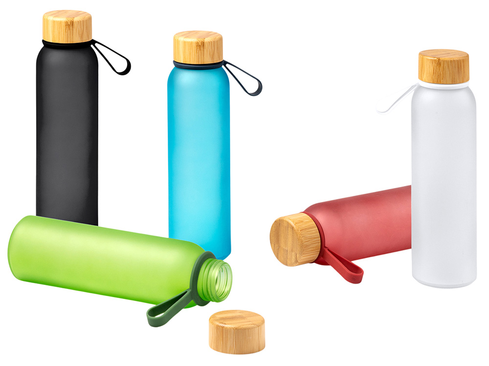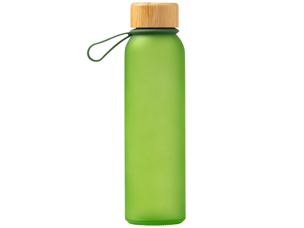 Полупрозрачная бутылка из переработанного стекла. Бамбуковая крышка с держателем. Объём: 500 мл. Поставляется в индивидуальной коробке. -