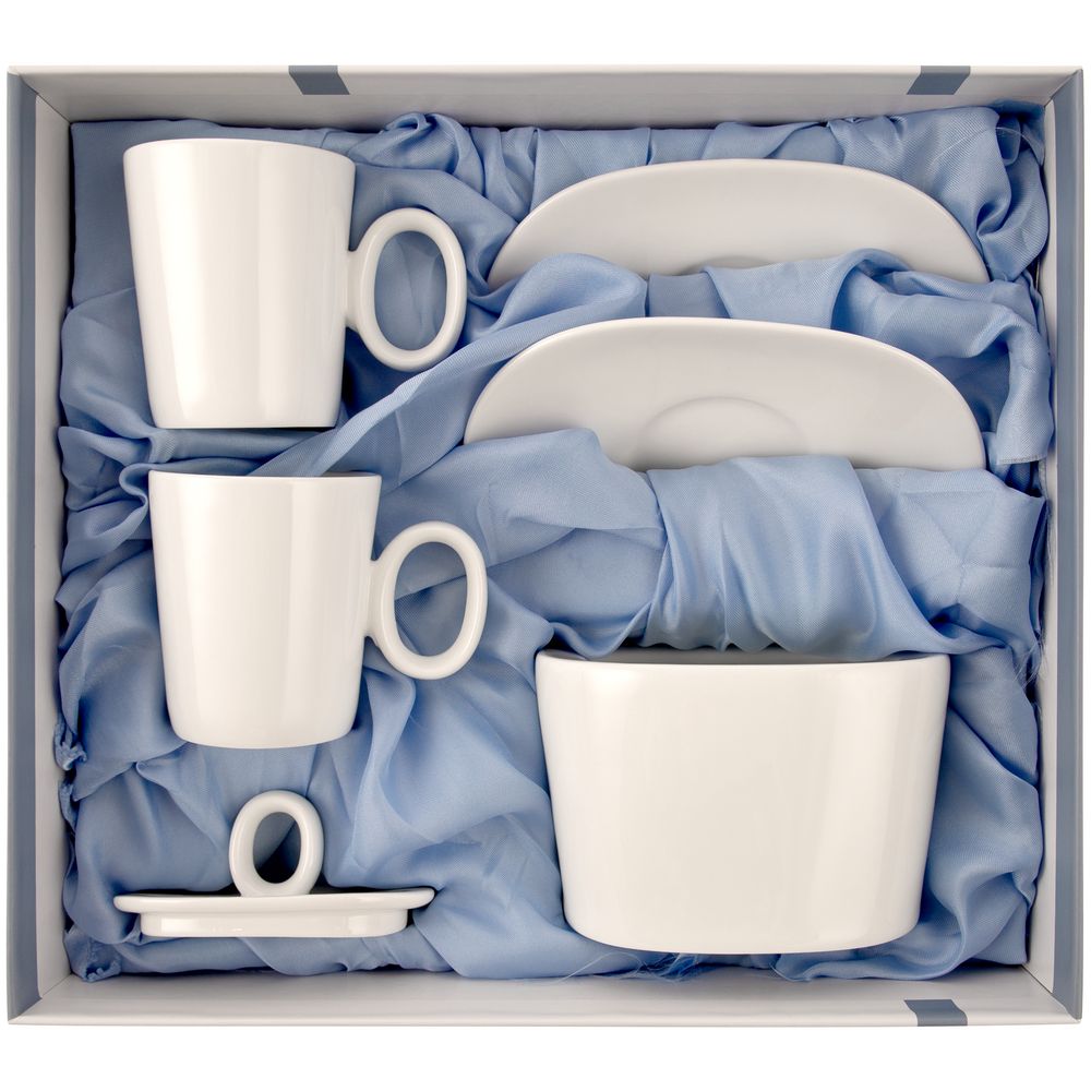 чашка: диаметр 6 см, ширина с ручкой 9 см, высота 6,9 см; блюдце 13,9х11х1,6 см; сахарница 8,5х10,7х9,5 см; упаковка 26,3х23,5х10 см
