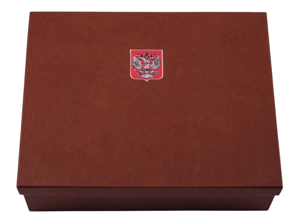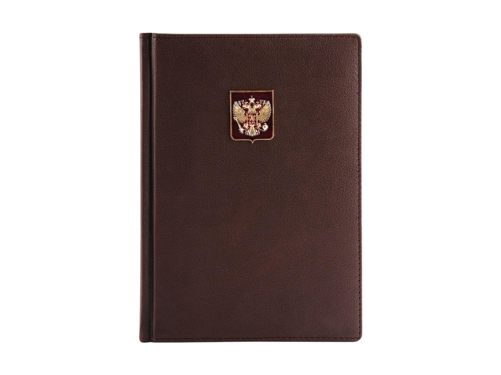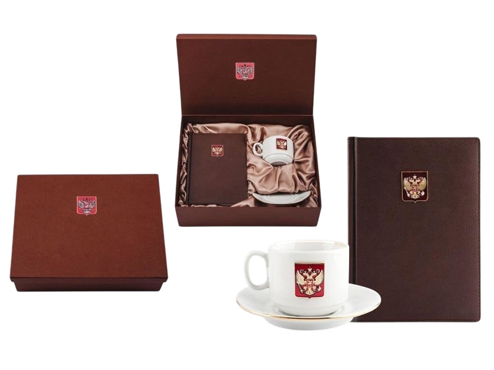 Ежедневник формата А5 с декором Герб РФ на щите и фарфоровая чайная пара с золотой отводкой края чашки и блюдца декорированная металлическим барельефом Двуглавый орел.
