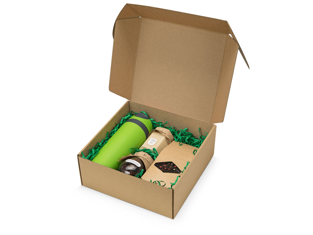 Набор состоит из термокружки, баночки крем-мёда с кокосом и миндалём, варенья из сосновых шишек, чёрного чая. Набор упакован в крафтовую картонную коробку с бумажным наполнителем. -