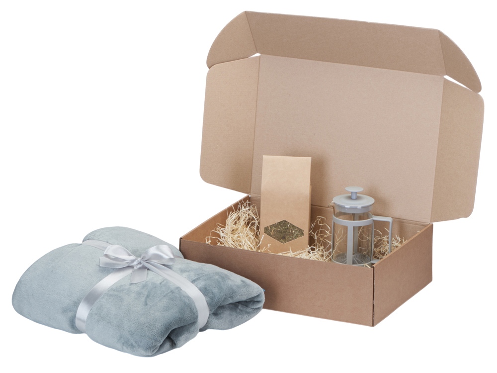 Набор продуман до мелочей. Когда зимним вечером подходит время чая, хочет завернуться в мягкий и теплый плед и наслаждаться любимым напитком, который можно заварить во френч прессе, входящем в комплект. Набор упакован в стильную крафтовую коробку. -