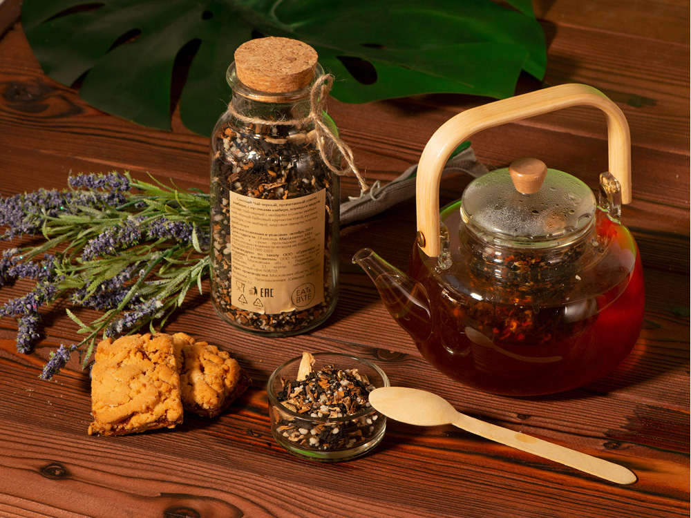 Состав: чай чёрный с имбирём и соком имбиря (чай чёрный байховый крупнолистовой, кусочки имбиря, сок имбиря), медовые гранулы, корица дроблёная.