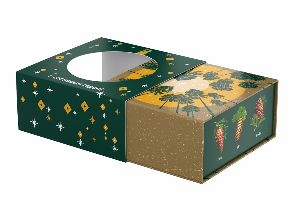 Аромат и вид хвои – символ Рождества и Нового года. Хвойная шкатулка С сосновым годом! оформлена праздничным паттерном и изображением шишек разных хвойных деревьев. На крышке шкатулки помещена иллюстрация, изображающая вид снизу вверх на звёздное небо и уходящие ввысь сосны. При надевании на шкатулку шубера (суперобложки) с круглым отверстием, на крышке шкатулки появляется вырубное изображение новогоднего шарика.