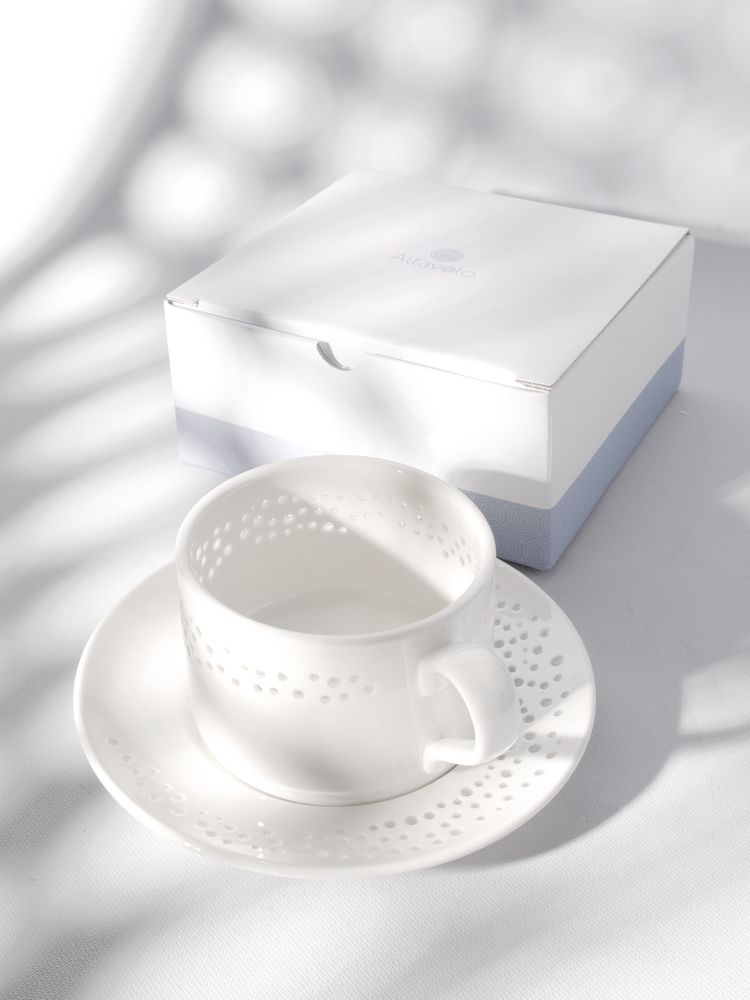 Чайная пара Coralli — легкая, словно светящаяся изнутри посуда с легендарным узором «рисовое зерно». Благодаря тонкому слою прозрачной глазури кружка выглядит кружевной и ажурной, при этом напиток гарантированно остается внутри.