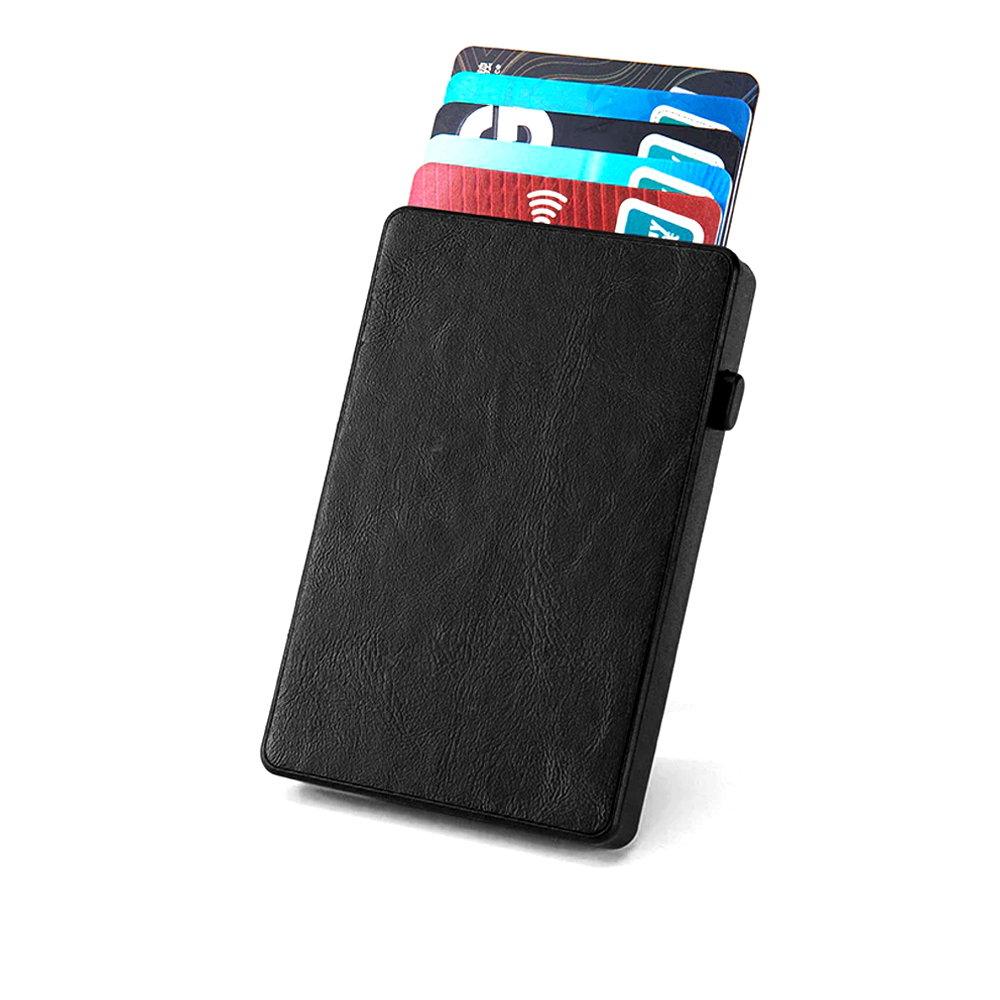 Современный практичный способ хранить и использовать банковские карты – держатель Amir с приятным покрытием из искусственной кожи. Боковая кнопка позволяет легко извлекать карты из бокса с защитным покрытием против копирования данных. Может вместить 5 карт, информация носит справочный характер, поскольку количество вмещаемых карт зависит от их толщины.- Виды нанесений: Тиснение, УФ-печать, Тиснение фольгой, УФ-Лак, УФ-Цвет+Лак