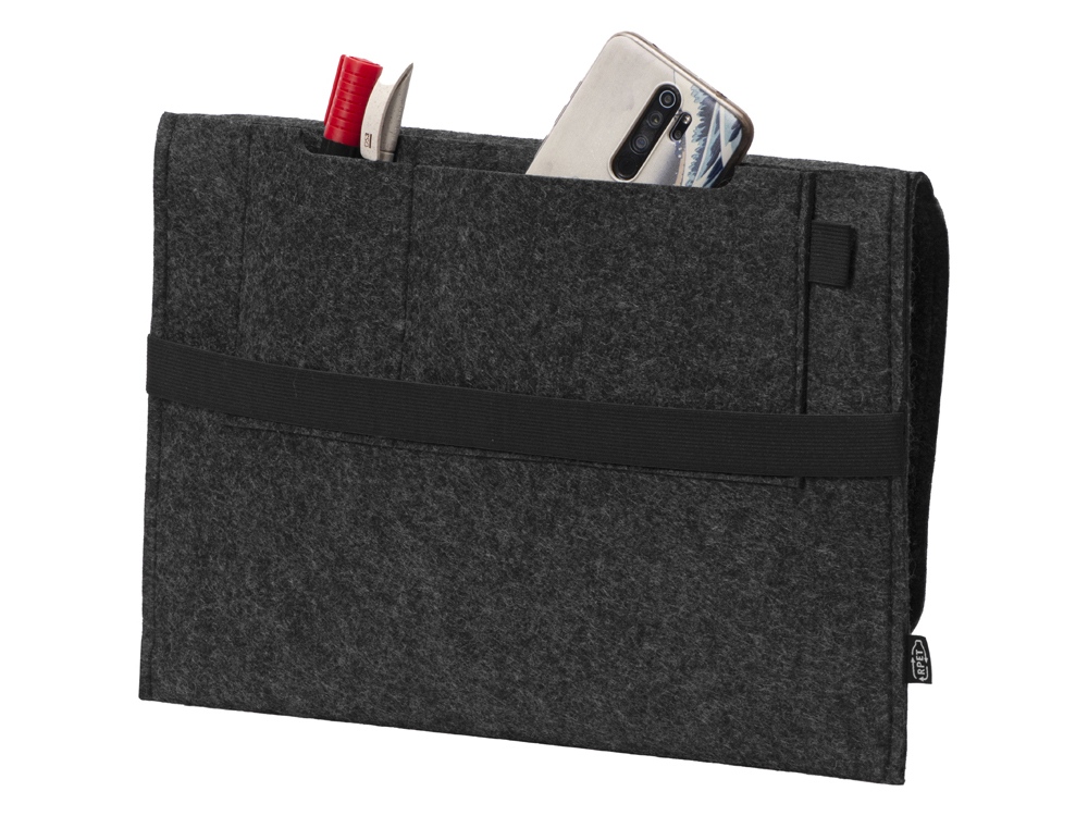 Чехол для ноутбука выполнен из фетра толщиной 3 мм. С передней стороны расположен органайзер размером 13x27 см для канцелярских принадлежностей, карт и телефона. Чехол фиксируется в закрытом виде с помощью эластичной ленты. -
