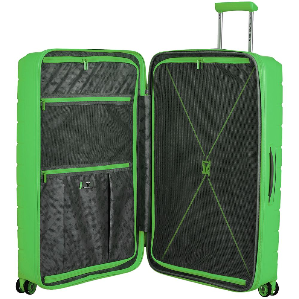 - Чемодан с 2 отделениями: одно отделение с сетчатым разделителем и прижимными ремнями, а второе оснащено перегородкой на молнии с двумя карманами