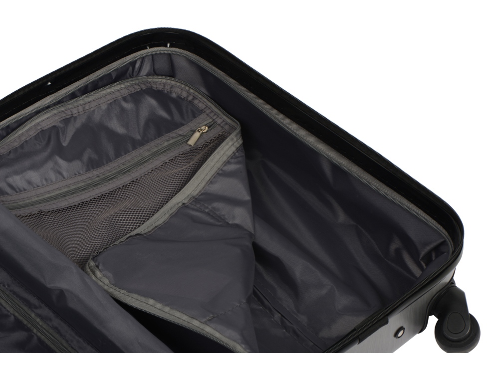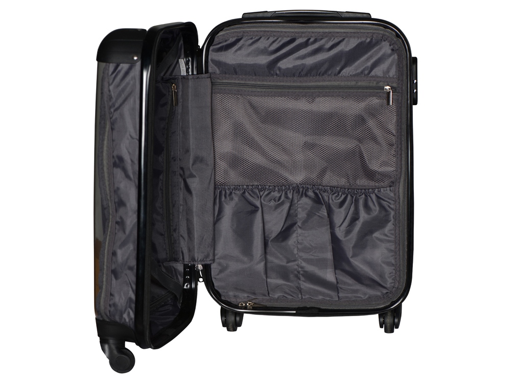 Удобен и незаменим для поездок на любые расстояния, можно брать в салон самолета благодаря компактному размеру, который был специально разработан в соответствии с требованиями большинства авиакомпаний. Одна боковая сторона из прозрачного пластика с возможность размещать бумажную вставку с вашим нанесение, 2 вместительных отделения - одно на молнии с чехлом, второе - с ремнями для фиксации одежды. На подкладке 2 внутренних кармана на молнии для хранения мелочей.