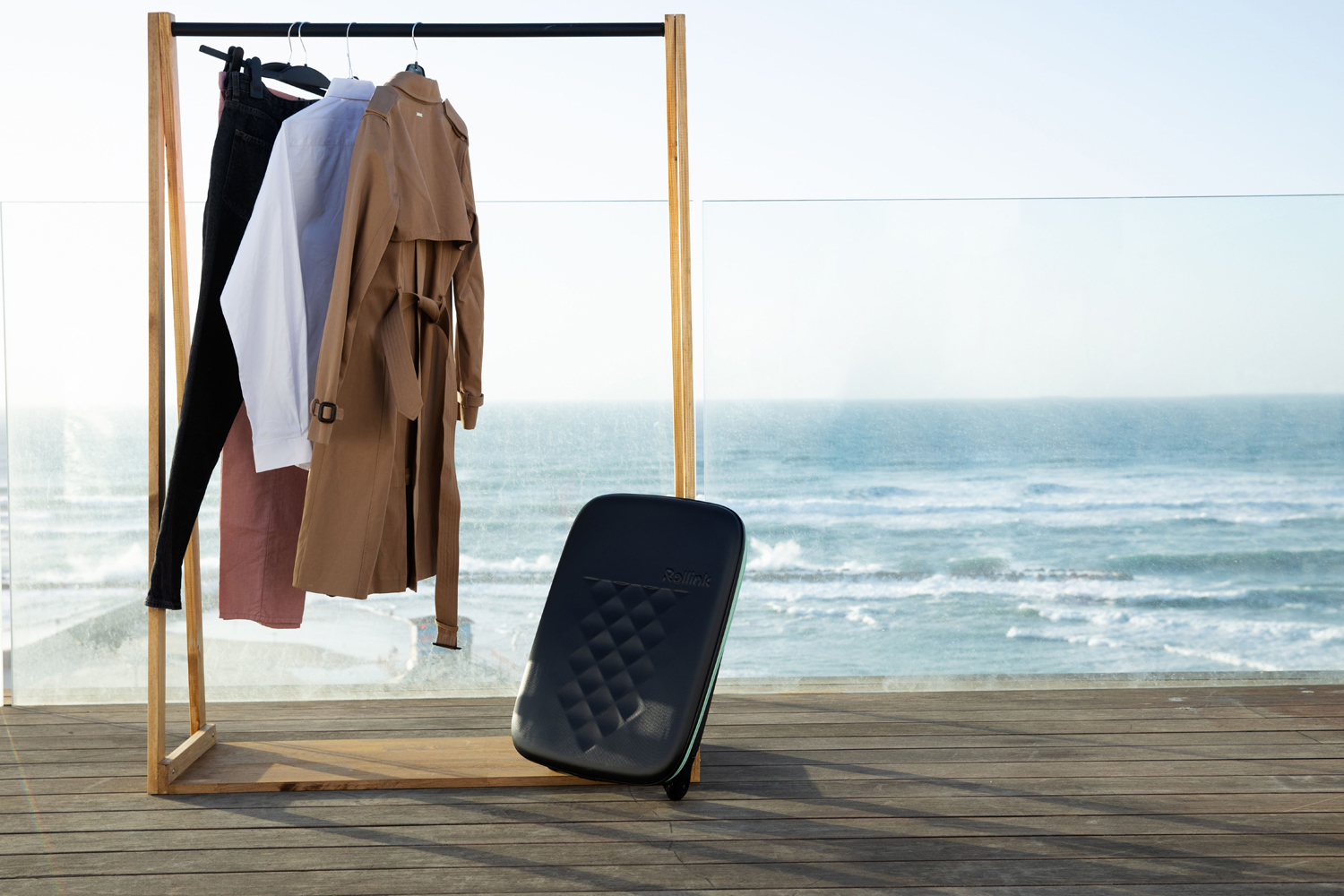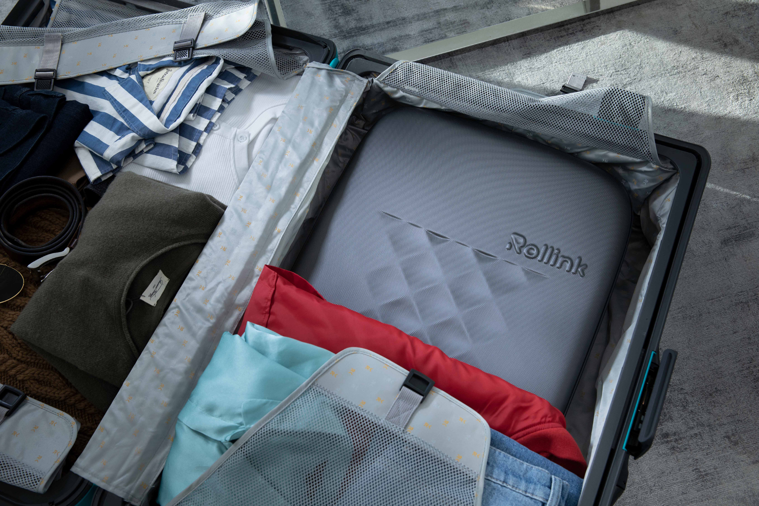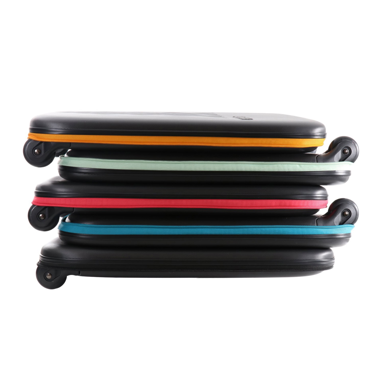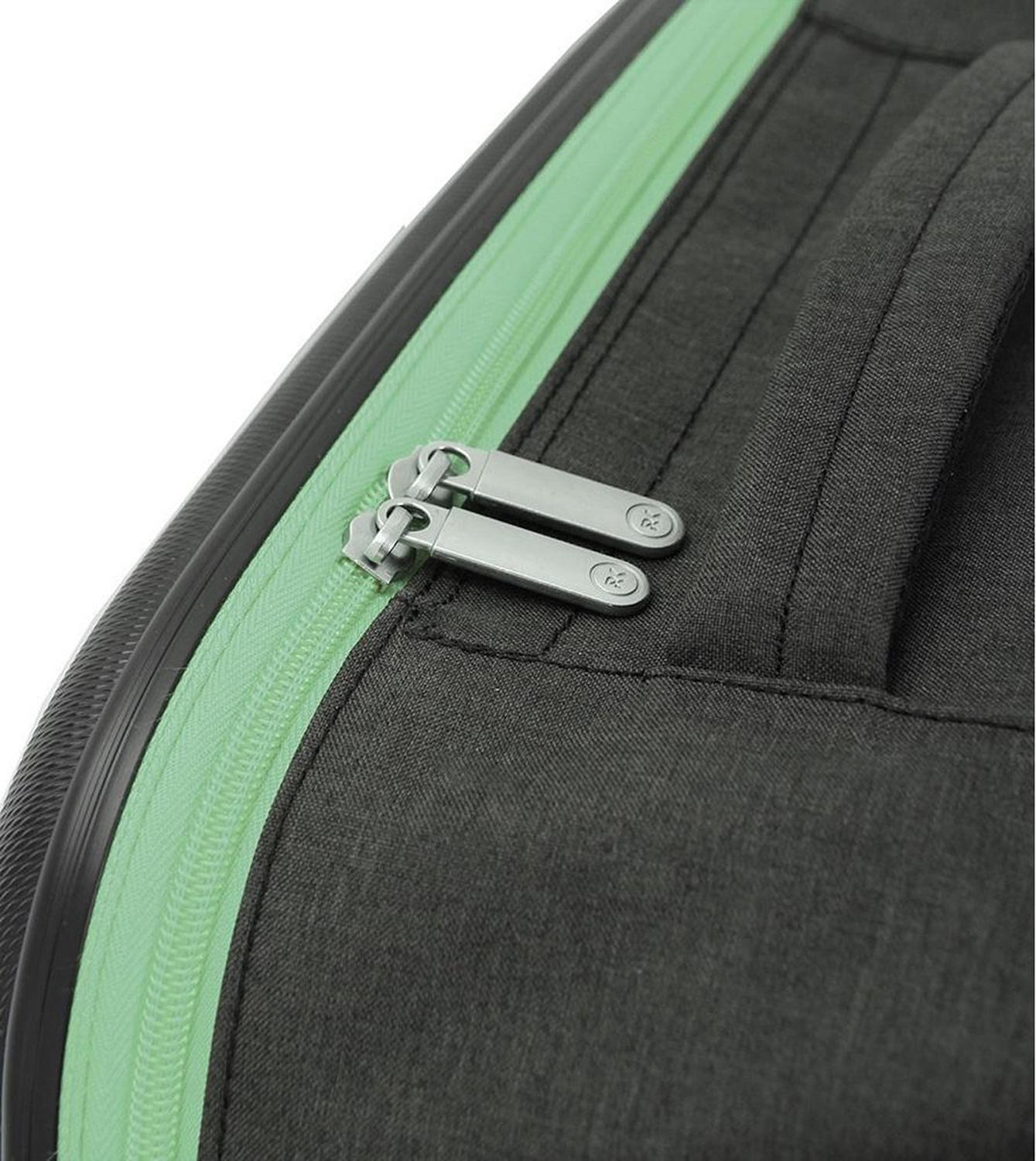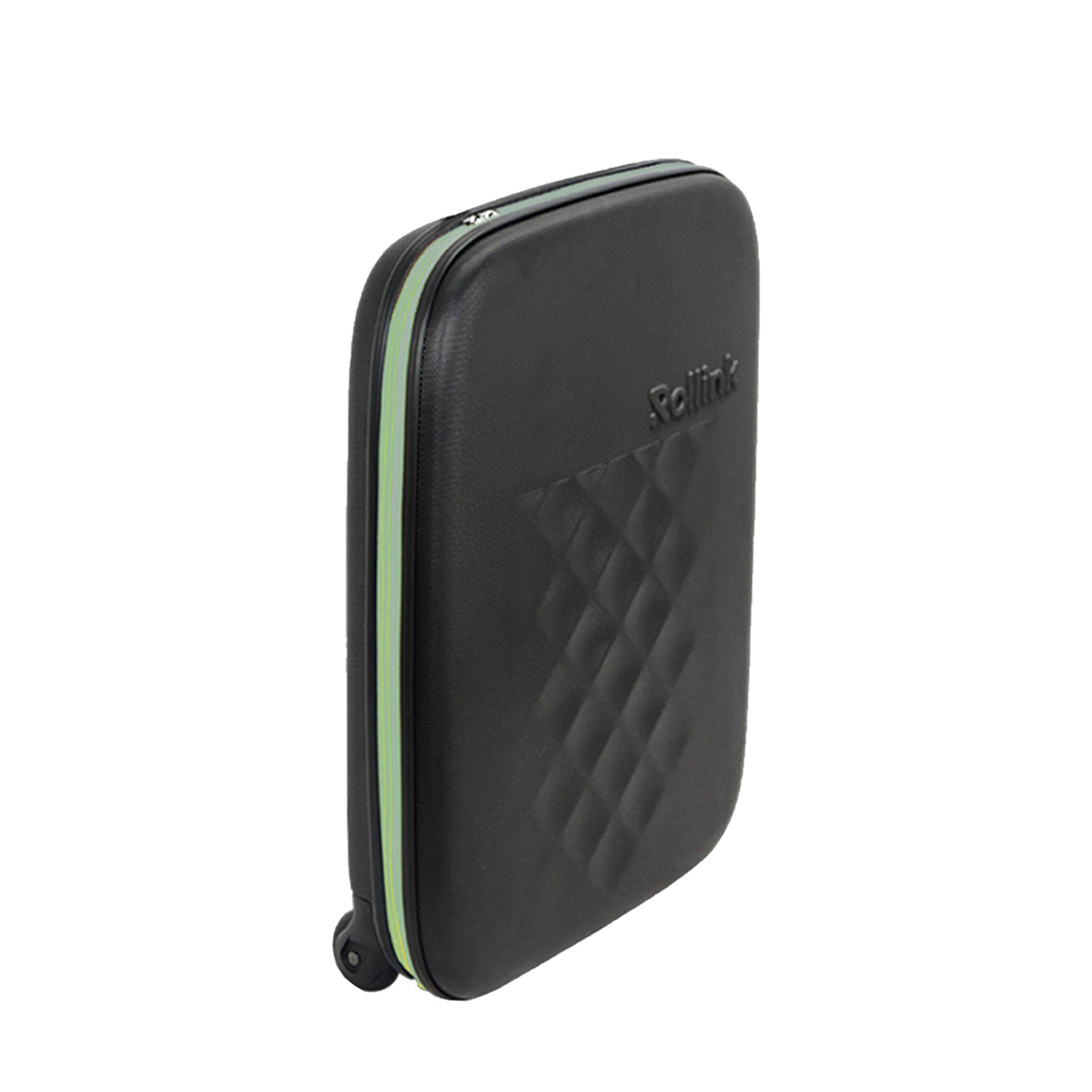 Складной легкий чемодан Rollink Earth черного цвета с зеленой молнией. Размер 55х40х20 см. В сложенном виде толщина составляет 5 см, с колёсами 8,5 см. Объем 40 л. Вес 2,2 кг. Жесткие стенки сделаны из ударопрочного полипропилена. Бока мягкие, из полиэстера с водоотталкивающей пропиткой. Внутри два откидывающихся жестких клапана на дне и вверху чемодана, крепятся липучками и сохраняют форму чемодана в собранном виде. Боковой easy access карман 12х19 см на липучке для документов и телефона. Удлиненная надежная выдвижная телескопическая ручка из алюминия с несколькими уровнями фиксации высоты ручки (от пола 80/94/104 см) для людей разного роста и удобная мягкая ручка сверху чемодана, чтобы было удобно нести его в руках. 2 колеса со специальным покрытием и подшипниками для более плавного и бесшумного передвижения. Высококачественная молния зеленого цвета.