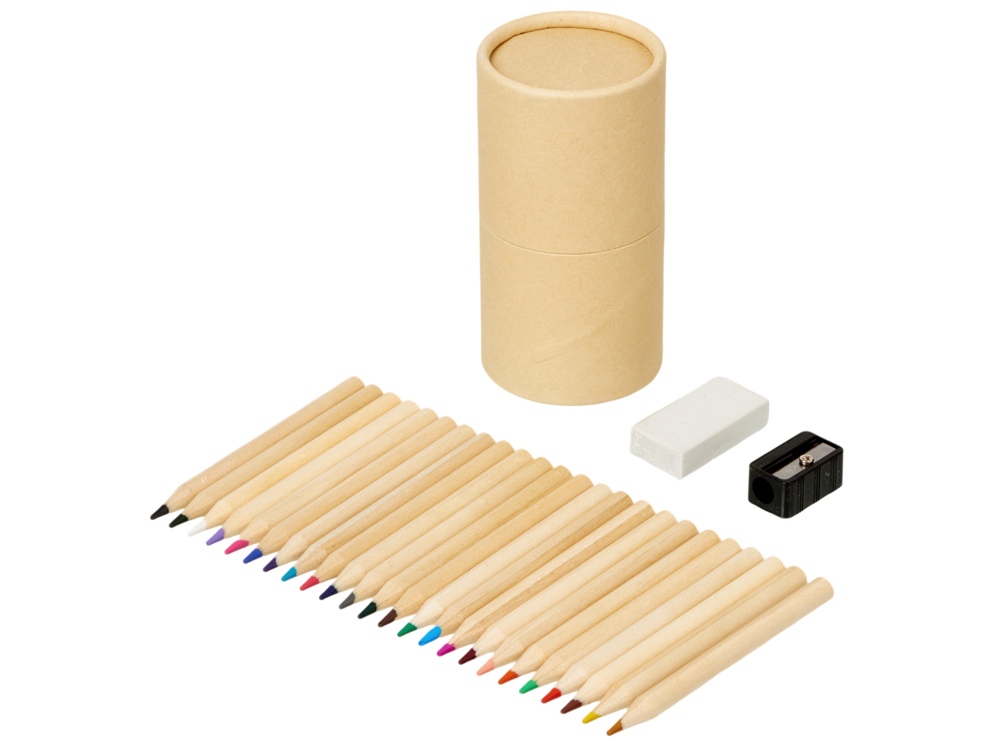 Набор из 24 цветных карандашей, ластика и точилки в круглом картонном футляре, который удобно использовать как карандашницу. -