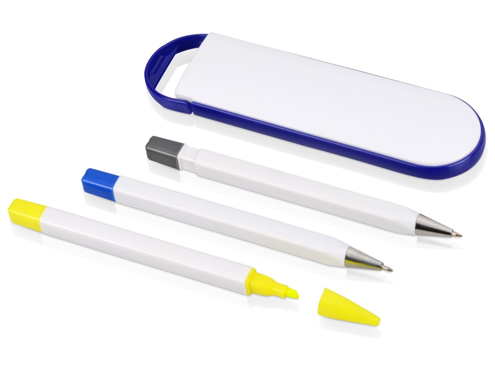 Набор включает в себя шариковую ручку, маркер, карандаш и футляр. Возможность нанесения логотипа на футляр и корпус принадлежностей поможет сделать набор еще ярче. -