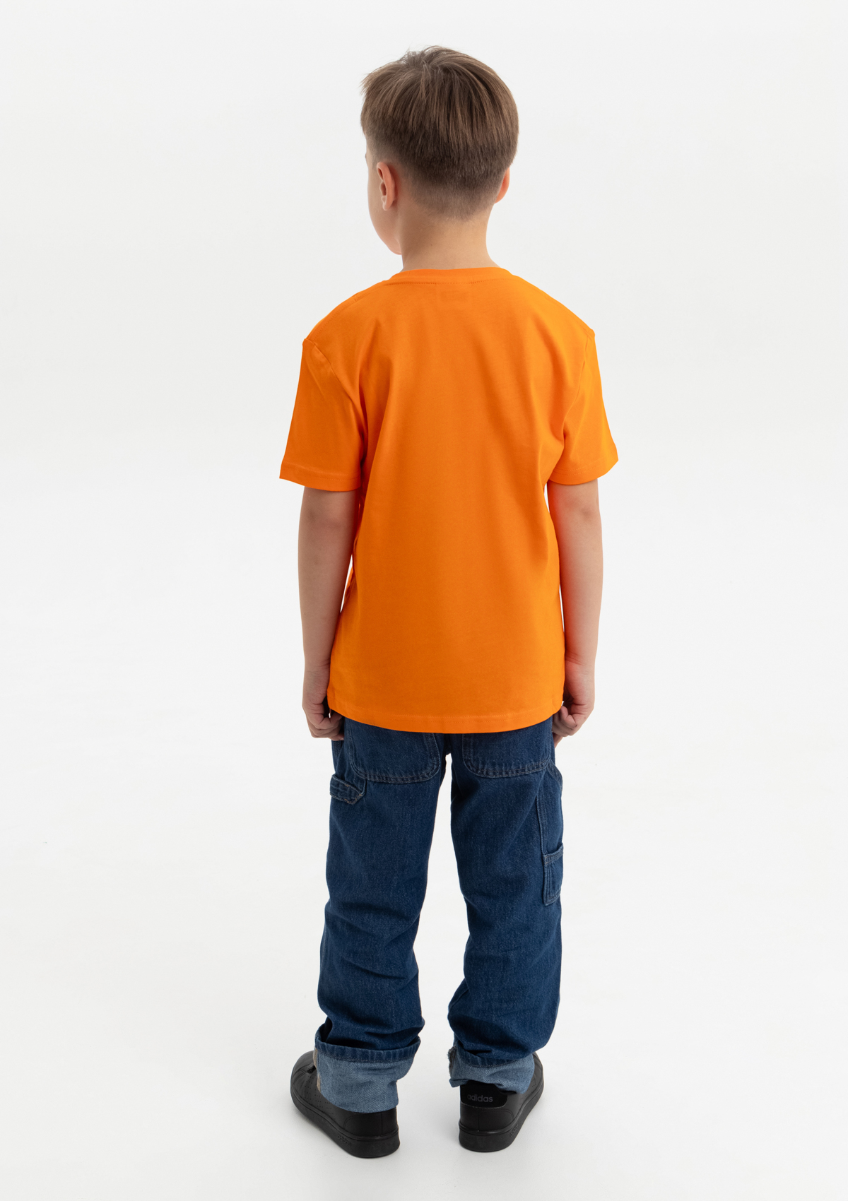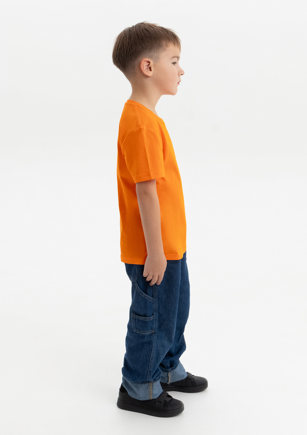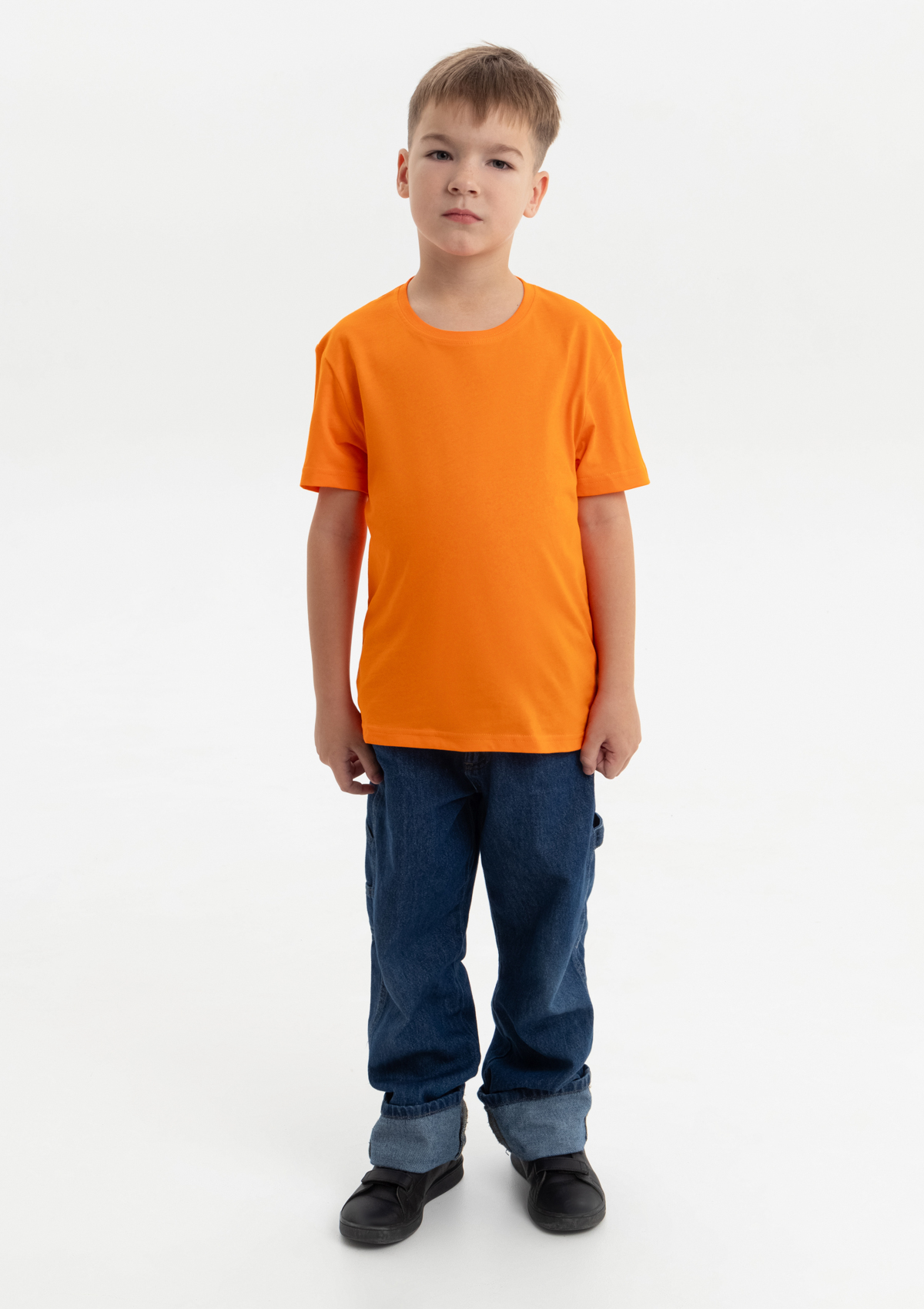 Детская футболка свободного силуэта с округлым воротом и втачным рукавом. Плечевые швы и шов горловины спинки усилены настрочной бейкой из основного полотна.