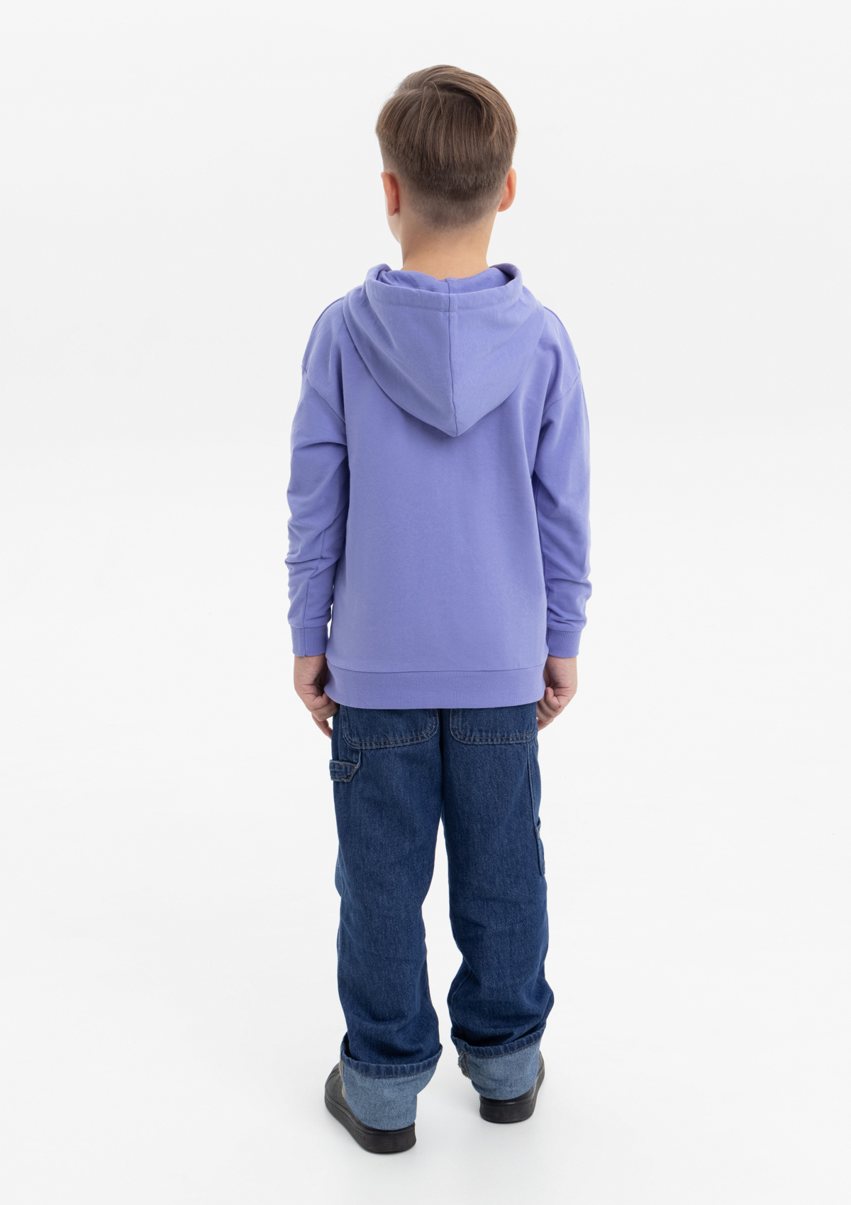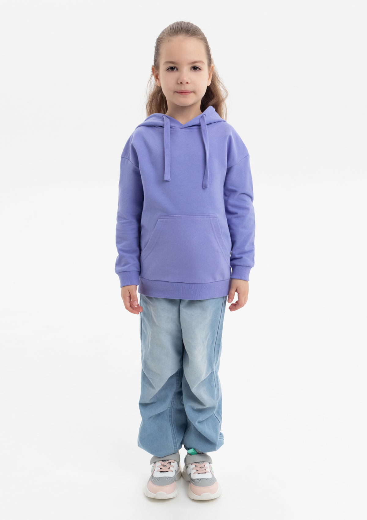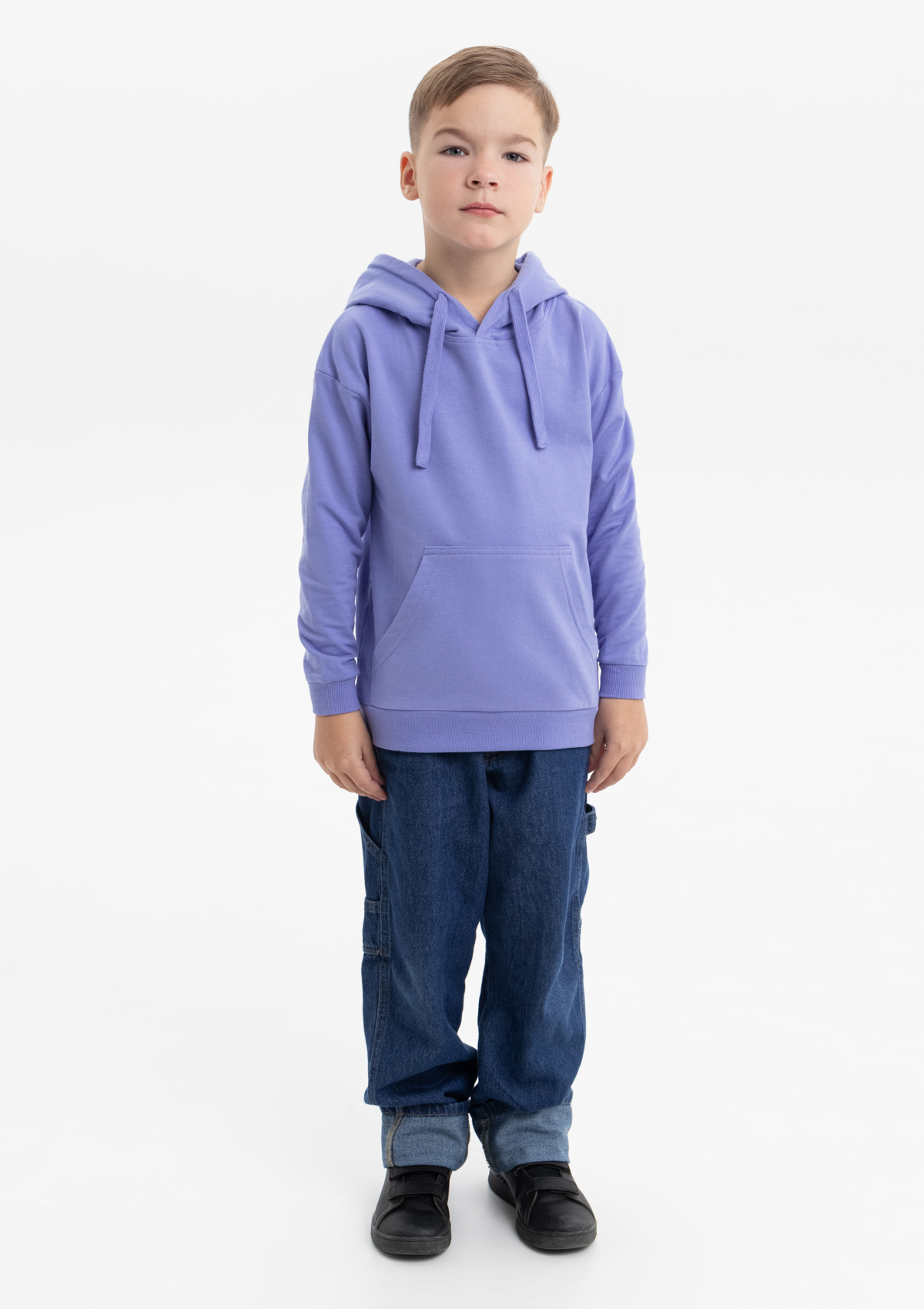 Модель прямого силуэта с капюшоном комфортной глубины, спущенной линией плеча и накладным карманом-кенгуру. Капюшон регулируется плоским шнуром, горловина спинки усилена киперной лентой. Манжет и низ изделия выполнены широкой эластичной резинкой в тон основному цвету.