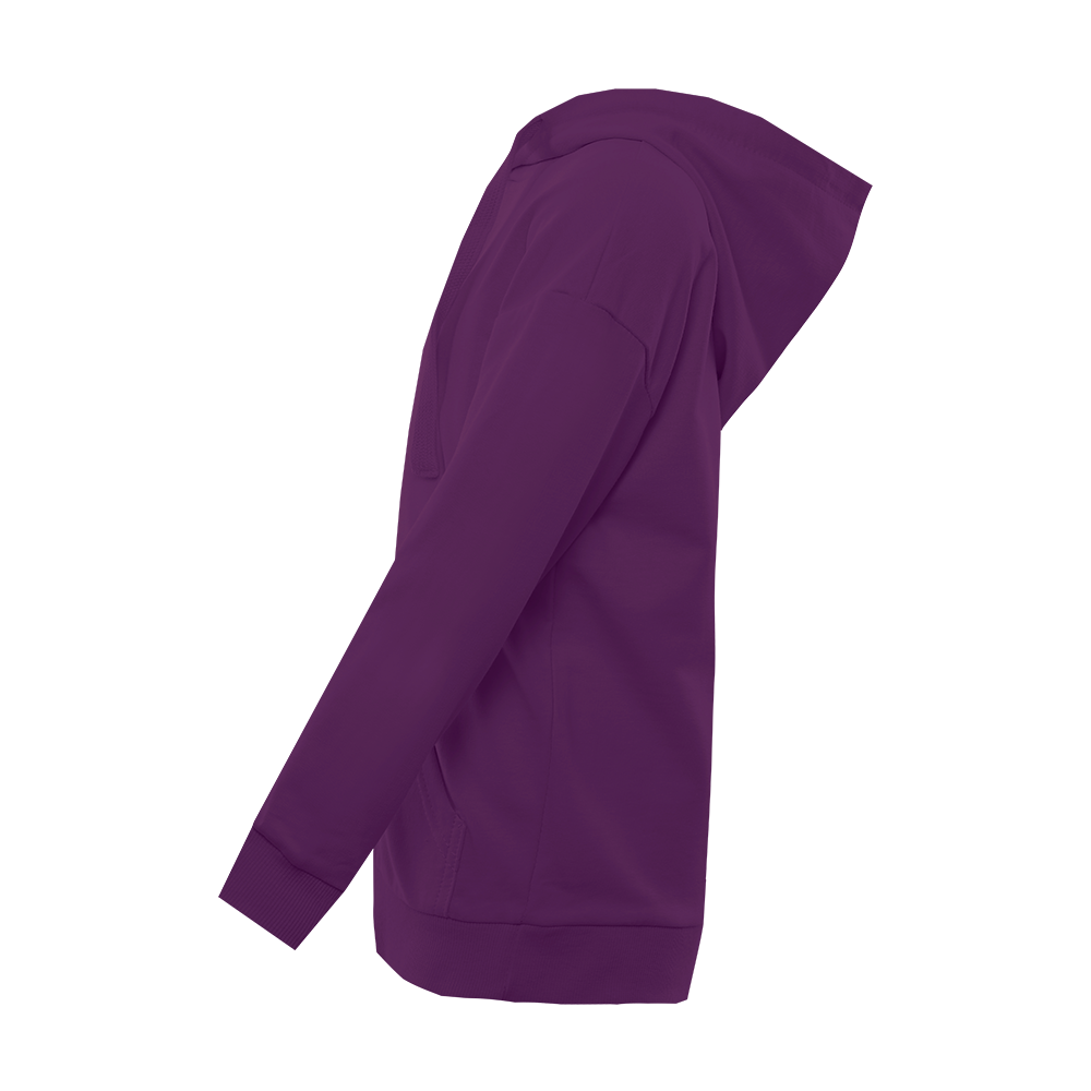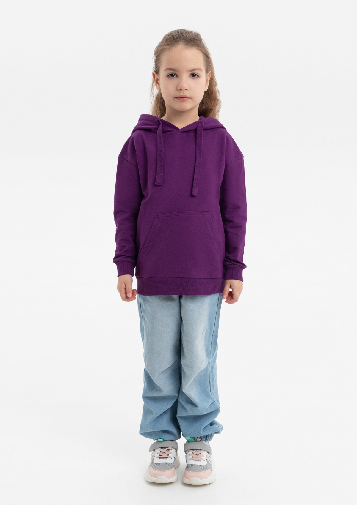 Модель прямого силуэта с капюшоном комфортной глубины, спущенной линией плеча и накладным карманом-кенгуру. Капюшон регулируется плоским шнуром, горловина спинки усилена киперной лентой. Манжет и низ изделия выполнены широкой эластичной резинкой в тон основному цвету.